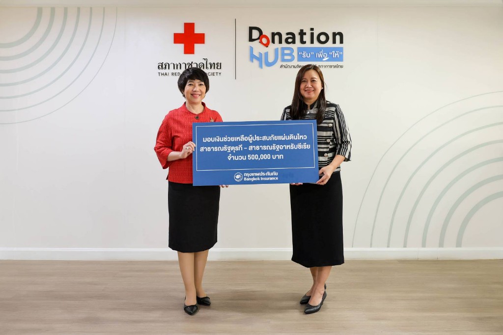 นางสาวปวีณา จูชวน (ขวา) ผู้ช่วยกรรมการผู้อำนวยการใหญ่ บริษัท กรุงเทพประกันภัย จำกัด (มหาชน) หรือ BKI เป็นผู้แทนบริษัทฯ มอบเงินช่วยเหลือผู้ประสบภัยแผ่นดินไหวสาธารณรัฐตุรกีและสาธารณรัฐอาหรับซีเรีย จำนวน 500,000 บาท (ห้าแสนบาทถ้วน) ให้แก่ นางจันทร์ประภา วิชิตชลชัย (ซ้าย) รองผู้อำนวยการสำนักงานจัดหารายได้ สภากาชาดไทย เพื่อส่งต่อความช่วยเหลือผ่านสภาเสี้ยววงเดือนแดงตุรกีและสภาเสี้ยววงเดือนแดงอาหรับซีเรีย ในฐานะสมาชิกขบวนการกาชาดระหว่างประเทศ (RCRC Movement) ที่มีบทบาทด้านมนุษยธรรมช่วยเหลือบรรเทาทุกข์ผู้ประสบภัยพิบัติต่างๆ ณ ห้องรับรอง ชั้น 1 ตึกอำนวยนรธรรม สภากาชาดไทย เมื่อวันที่ 23 กุมภาพันธ์ 2566