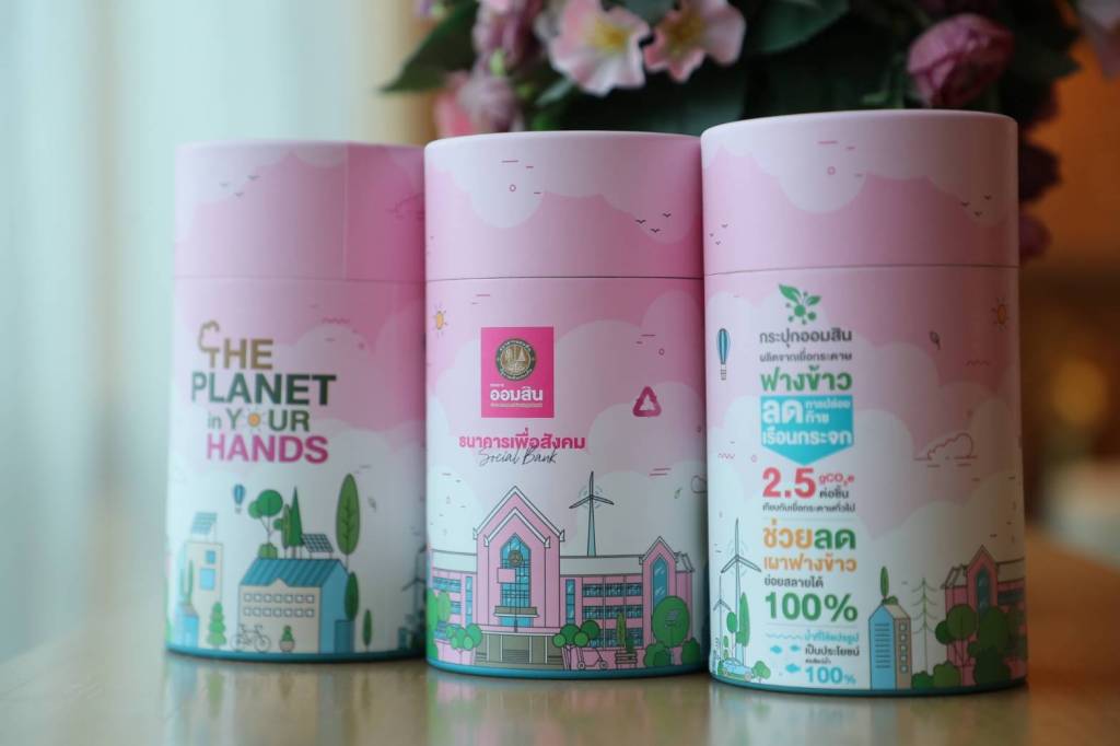 โดยกระปุกออมสินที่จัดทำขึ้นในโอกาสนี้ ผลิตจากเยื่อกระดาษฟางข้าว ซึ่งเป็นวัตถุดิบเหลือใช้จากการเก็บเกี่ยวข้าว มาผลิตเป็นกระปุกออมสินโดยไม่สิ้นเปลืองทรัพยากรใหม่ และลดการเผาฟางข้าวที่ทำลายหน้าดิน โดยตลอดกระบวนการผลิตกระปุกออมสินรักษ์โลก 1 ชิ้น ช่วยลดการปล่อยก๊าซเรือนกระจกได้ 2.5 gCO2e