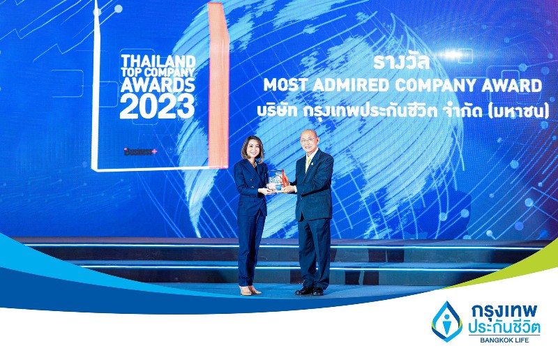 กรุงเทพประกันชีวิต โดย นางสาวอรนาฎ นชะพงษ์ (ซ้าย) ผู้อำนวยการอาวุโส สายกลยุทธ์และบริหารจัดการลูกค้าและผู้มุ่งหวัง รับรางวัลสุดยอดองค์กรธุรกิจไทย จากงาน THAILAND TOP COMPANY AWARDS 2023 ประเภทความเป็นเลิศ “MOST ADMIRED COMPANY AWARD” ในฐานะองค์กรที่ครองใจผู้บริโภค ตอกย้ำความสำเร็จ 3 ปีซ้อนในการดำเนินธุรกิจด้านประกันชีวิตด้วยกลยุทธ์การเติบโตอย่างยั่งยืน พร้อมรองรับความเปลี่ยนแปลงผ่านการพัฒนาองค์กร ผลิตภัณฑ์และบริการอย่างรอบด้าน โดยคำนึงถึงความต้องการและพฤติกรรมของผู้บริโภคในปัจจุบันและอนาคต เพื่อสร้างความมั่นคง มั่งคั่ง และส่งเสริมด้านสุขภาพให้แก่ประชาชน สู่การมีคุณภาพชีวิตที่ดีอย่างยั่งยืน โดยได้รับเกียรติจาก