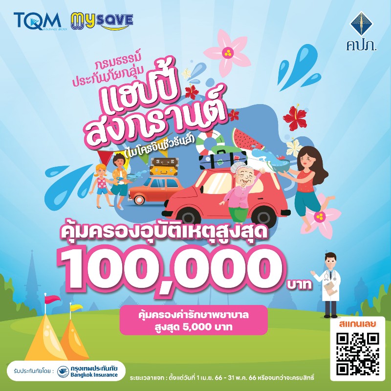 และประกันภัยสงกรานต์บ้านหายห่วง ที่ให้ความคุ้มครองสูงสุด 30,000 บาท ทั้ง 2 กรมธรรม์ให้ความคุ้มครอง 30 วัน เริ่มวันนี้ – 31 พ.ค. 66 ลงทะเบียนฟรีผ่านช่องทางออนไลน์หรือศูนย์บริการทั่วประเทศของ TQM และกว่า 5,000 สาขาของ MY SAVE