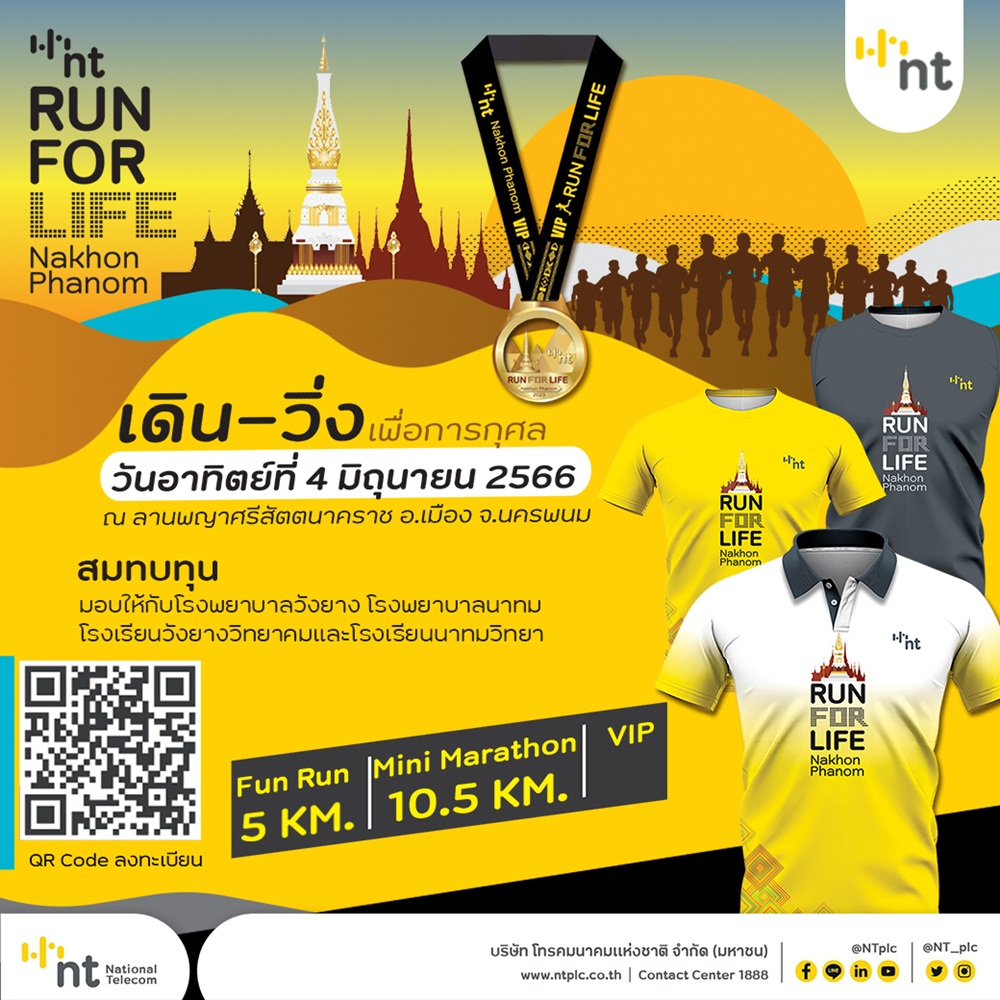 NT จัดกิจกรรมเดิน-วิ่งการกุศล NT RUN FOR LIFE Nakhon Phanom บนเส้นทางสายวัฒนธรรมริมฝั่งโขง ณ ลานพญาศรีสัตตนาคราช นครพนม นำรายได้สมทบทุนจัดซื้อเครื่องมือแพทย์ให้กับโรงพยาบาลวังยาง โรงพยาบาลนาทม และจัดซื้ออุปกรณ์การศึกษาให้กับโรงเรียนวังยางวิทยาคม โรงเรียนนาทมวิทยา ในวันอาทิตย์ที่ 4 มิถุนายน 2566นางอภิรดี อาษาพันธ์ รองกรรมการผู้จัดการใหญ่สายงานขายและปฏิบัติการลูกค้า 2 บริษัท โทรคมนาคมแห่งชาติ จำกัด (มหาชน) หรือ NT กล่าวว่าการจัดกิจกรรมเดิน-วิ่ง การกุศล NT RUN FOR LIFE Nakhon Phanom บนเส้นทางสายวัฒนธรรมริมฝั่งโขง ณ ลานพญาศรีสัตตนาคราช อำเภอเมือง จังหวัดนครพนม เป็นส่วนหนึ่งของความรับผิดชอบต่อสังคมและสิ่งแวดล้อม หรือ CSR ของ NT ที่จัดขึ้นเพื่อกระตุ้นให้ประชาชนเห็นความสำคัญในการออกกำลังกาย ดูแลรักษาสุขภาพพลานามัยให้แข็งแรง และยังเป็นโอกาสในการช่วยเหลือสังคมร่วมกันโดย NT จะนำรายได้หลังหักค่าใช้จ่ายสมทบทุนจัดซื้ออุปกรณ์จำเป็นให้กับโรงพยาบาลและโรงเรียนของรัฐจำนวน 4 แห่งในจังหวัดนครพนม ได้แก่ การจัดซื้ออุปกรณ์การแพทย์ให้กับโรงพยาบาลวังยางและโรงพยาบาลนาทม เพื่อช่วยดูแลรักษาผู้ป่วย และการจัดซื้ออุปกรณ์การศึกษาให้กับโรงเรียนวังยางวิทยาคมและโรงเรียนนาทมวิทยา เพื่อสนับสนุนด้านการศึกษาให้กับเยาวชนที่จะเติบโตอย่างมีคุณภาพในอนาคต สอดคล้องกับนโยบายของประเทศในการสร้างสังคมที่มีคุณภาพสำหรับกิจกรรมครั้งนี้กำหนดจัดการแข่งขันในวันอาทิตย์ที่ 4 มิถุนายน 2566 ณ ลานพญาศรีสัตตนาคราช จังหวัดนครพนม โดยแบ่งเป็น 3 ประเภท ได้แก่ ประเภทฟันรัน (Fun Run) ระยะทาง 5 กิโลเมตร ค่าสมัคร 500 บาท ประเภทมินิมาราธอน (Mini Marathon Plus) ระยะทาง 10.5 กิโลเมตร ค่าสมัคร 600 บาท และประเภท VIP ร่วมวิ่งระยะทางใดก็ได้ ค่าสมัคร 1,500 บาท ซึ่งผู้เข้าแข่งขันจะได้รับ 1. เสื้อที่ระลึกตามระยะทาง 2. หมายเลขแข่งขัน (BIB) 3. เหรียญรางวัลเมื่อเข้าเส้นชัย 4. Chip Timing เฉพาะ Mini Marathon และ VIP 5. อาหารและเครื่องดื่มหลังเส้นชัยผู้สนใจเข้าร่วมแข่งขันในรายการ NT RUN FOR LIFE Nakhon Phanom สมัครได้ตั้งแต่บัดนี้ – วันที่ 30 เมษายน 2566 เวลา 23:59 น. ที่ลิงก์ https://race.thai.run/ntrun/ ดูรายละเอียดเพิ่มเติมได้ที่เฟซบุ๊ก https://www.facebook.com/NTRunforLife?mibextid=ZbWKwL