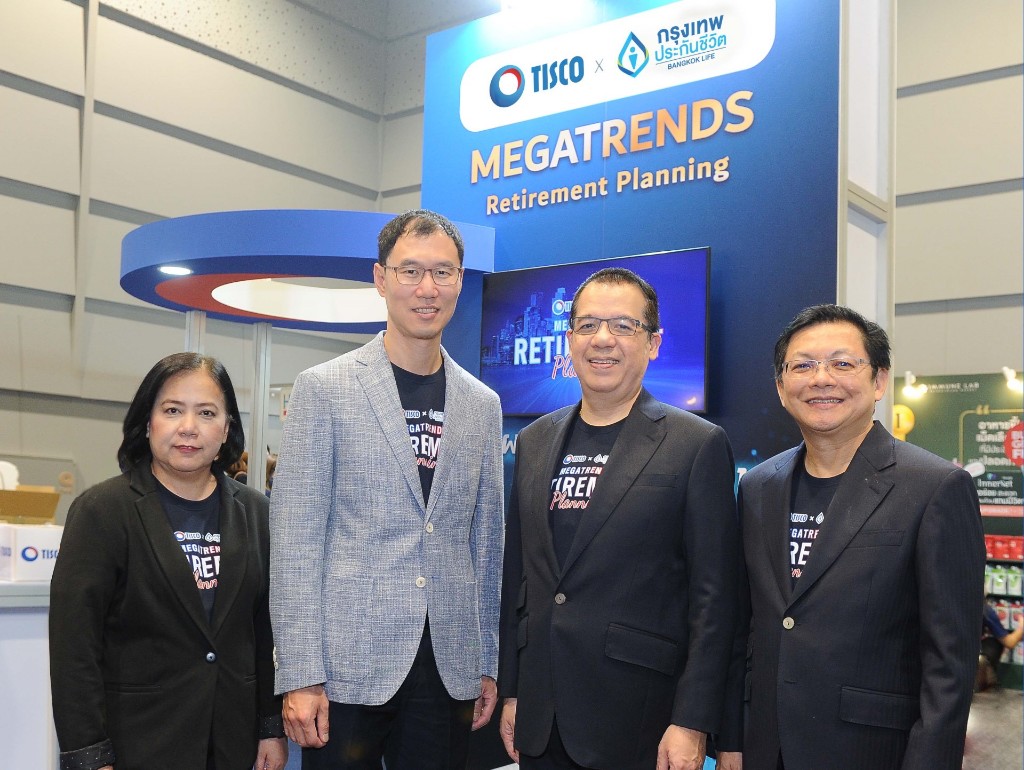 บริษัท กรุงเทพประกันชีวิต จำกัด (มหาชน) ร่วมกับ ธนาคารทิสโก้ จำกัด (มหาชน) (TISCO) เดินหน้าสร้างความมั่นคงทางการเงินให้คนไทย ในงานมหกรรมสุขภาพยิ่งใหญ่สุดในประเทศ Thailand Healthcare 2023 “เกษียณสโมสร” นำโดย นายโชน โสภณพนิช กรรมการผู้จัดการใหญ่และประธานเจ้าหน้าที่บริหาร บริษัท กรุงเทพประกันชีวิต จำกัด (มหาชน) (ที่ 2 จากซ้าย) และ นายพิชา รัตนธรรม ผู้ช่วยกรรมการผู้จัดการใหญ่อาวุโส ธนาคารทิสโก้ จำกัด (มหาชน) (ที่ 3 จากซ้าย) พร้อมด้วยคณะผู้บริหารจากสององค์กรพันธมิตร ร่วมเปิดบูทแนะนำการวางแผนเกษียณ ที่เท่าทันต่อการเปลี่ยนแปลงของโลก (Megatrends Retirement Planning) ครอบคลุมทั้งในมิติการเสริมสร้างความรู้ การลงทุนในธุรกิจแห่งอนาคต และปกป้องความเสี่ยงหลังเกษียณ ด้วยประกันบำนาญที่มีผลประโยชน์ในขณะดำรงชีวิต (Living Benefit) สูง ประกันสุขภาพแบบเหมาจ่าย และประกันโรคร้ายแรงที่มีทุนประกันสูง ให้คนไทยได้เตรียมสุขภาพการเงินที่พร้อมตอบโจทย์ไลฟ์สไตล์การใช้ชีวิต และการเกษียณอย่างแท้จริง