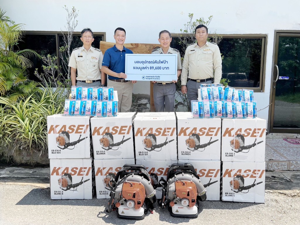 บริษัท กรุงเทพประกันภัย จำกัด (มหาชน) โดยนายนิยม มูลศรี (ที่ 2 จากซ้าย) ผู้จัดการสาขาอุตรดิตถ์ เป็นผู้แทนบริษัทฯ มอบเครื่องเป่าลม จำนวน 10 เครื่อง และเครื่องกรองน้ำพกพา จำนวน 30 ชุด มูลค่ารวม 89,600 บาท ให้แก่ นายบทมากร ศรีสุวรรณ (ที่ 2 จากขวา) ผู้อำนวยการสำนักบริหารพื้นที่อนุรักษ์ที่ 13 (แพร่) เพื่อเพิ่มประสิทธิภาพในการทำภารกิจป้องกันรักษาป่าและการดับไฟป่าในพื้นที่ภาคเหนือ ช่วยลดมลพิษจากการเกิดหมอกควันและฝุ่นพิษในอากาศ ตลอดจนช่วยบรรเทาผลกระทบต่อสุขภาพของประชาชน ณ สำนักบริหารพื้นที่อนุรักษ์ที่13 (แพร่) กรมอุทยานแห่งชาติ สัตว์ป่าและพันธุ์พืช จ.แพร่ เมื่อเร็วๆ นี้