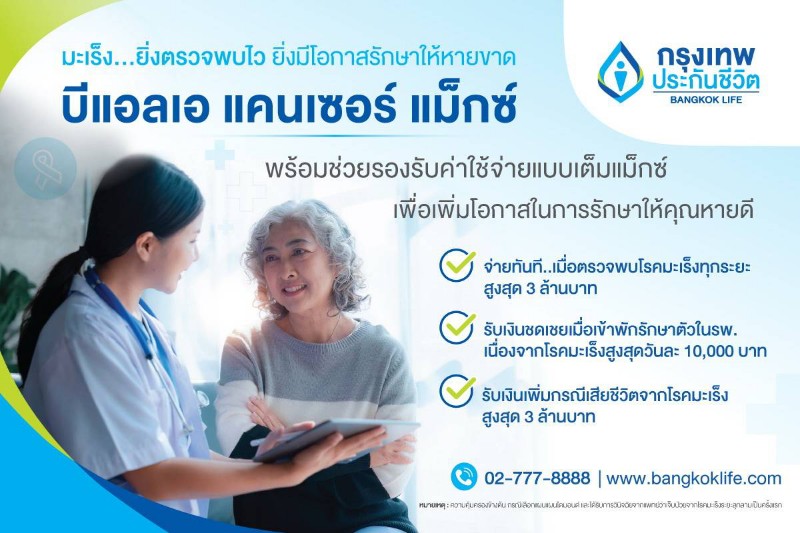 “กรุงเทพประกันชีวิต เราใส่ใจดูแลทุกคนทุกช่วงเวลา แบบประกัน บีแอลเอ แคนเซอร์ แม็กซ์ นี้ เป็นอีกหนึ่งทางเลือกที่สามารถช่วยผ่อนภาระค่าใช้จ่ายในวันที่สุขภาพเปลี่ยนแปลง มอบความอุ่นใจให้พร้อมรับการรักษาด้วยความคุ้มครองตั้งแต่ระยะเริ่มต้น ช่วยให้ใช้ชีวิตได้อย่างมั่นใจ พร้อมรับมือกับความเสี่ยงที่อาจจะเกิดขึ้นได้อย่างคลายกังวล” นายโชนกล่าว