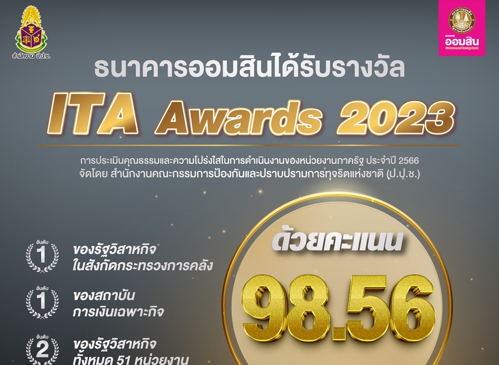 สำนักงานคณะกรรมการป้องกันและปราบปรามการทุจริตแห่งชาติ (ป.ป.ช.) ประกาศผลคะแนนการประเมินคุณธรรมและความโปร่งใสในการดำเนินงานของหน่วยงานภาครัฐ (ITA) ประจำปีงบประมาณ พ.ศ. 2566 เมื่อวันที่ 10 สิงหาคม 2566 โดยครองอันดับที่ 1 ของรัฐวิสาหกิจในสังกัดกระทรวงการคลัง อันดับที่ 1 ของสถาบันการเงินเฉพาะกิจ และเป็นอันดับที่ 2 ของรัฐวิสาหกิจไทยทั้งหมด 51 หน่วยงาน ด้วยผลคะแนน 98.56 คะแนน