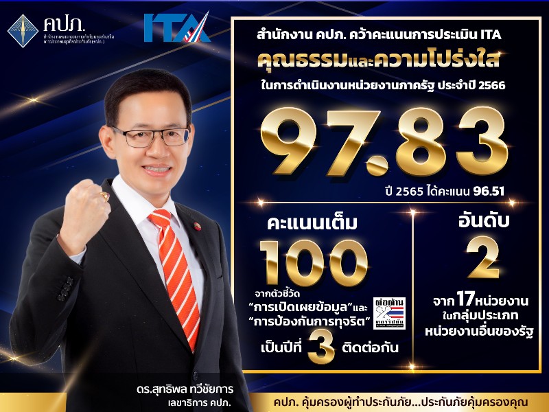 ดร. สุทธิพล ทวีชัยการ เลขาธิการคณะกรรมการกำกับและส่งเสริมการประกอบธุรกิจประกันภัย (เลขาธิการ คปภ.) เปิดเผยว่าตามที่สำนักงานคณะกรรมการป้องกันและปราบปรามการทุจริตแห่งชาติ (ป.ป.ช.) ได้ประกาศผลการประเมินคุณธรรมและความโปร่งใสในการดำเนินงานของหน่วยงานภาครัฐ (Integrity and Transparency Assessment : ITA) ประจำปีงบประมาณ 2566 โดยได้จำแนกหน่วยงานของรัฐออกเป็น 17 ประเภท ได้แก่ หน่วยงานของศาล องค์กรอิสระ องค์กรอัยการ และหน่วยงานในสังกัดรัฐสภา ส่วนราชการระดับกรม รัฐวิสาหกิจ องค์การมหาชน กองทุน หน่วยงานอื่นของรัฐ สถาบันอุดมศึกษา จังหวัด องค์กรปกครองส่วนท้องถิ่น และองค์กรปกครองส่วนท้องถิ่นรูปแบบพิเศษ ซึ่งในการประเมิน ITA ในปีนี้ มีหน่วยงานภาครัฐเข้าร่วมรับการประเมินทั้งหมดกว่า 8,323 หน่วยงาน มีคะแนนภาพรวมระดับประเทศอยู่ที่ 90.19 คะแนน โดยสำนักงาน ป.ป.ช. ได้มีการปรับเปลี่ยน Rating Score เพื่อเกิดความชัดเจนเกี่ยวกับระดับผลการประเมิน ITA ซึ่งการปรับระดับในครั้งนี้สอดคล้องกับค่าเป้าหมายในแผนแม่บทภายใต้ยุทธศาสตร์ชาติฯ มากขึ้น โดยในส่วนของสำนักงาน คปภ. ได้รับผลการประเมินด้วยคะแนน 97.83 ซึ่งคะแนนภาพรวมเมื่อเปรียบเทียบกับปีที่ผ่านมาเพิ่มขึ้น 1.32 จัดเป็นอันดับที่ 2 จาก 17 หน่วยงานในกลุ่มประเภทหน่วยงานอื่นของรัฐ โดยได้รับ 100 คะแนนเต็มจากตัวชี้วัด “การเปิดเผยข้อมูล” และ “การป้องกันการทุจริต” เป็นปีที่สามติดต่อกัน