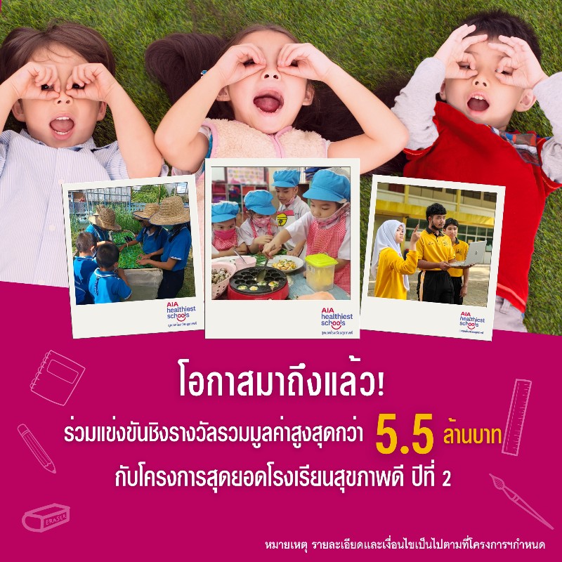 กรุงเทพฯ, 29 สิงหาคม 2566 – เอไอเอ ประเทศไทย เปิดตัวโครงการ “AIA Healthiest Schools – สุดยอดโรงเรียนสุขภาพดี ปีที่ 2” หลังจากประสบความสำเร็จอย่างสูงในปีที่ผ่านมา ซึ่งมีเป้าหมายเพื่อมุ่งเสริมสร้างและปลูกฝังพฤติกรรมการใช้ชีวิตที่ดีต่อสุขภาพสำหรับนักเรียนอายุระหว่าง 5 – 16 ปี โดยส่งเสริมทั้งด้านการรับประทานอาหารที่มีประโยชน์ การใช้ชีวิตอย่างกระฉับกระเฉง รวมถึงกิจกรรมที่ทำให้มีสุขภาพใจที่ดี ตลอดจนเน้นสร้างการเปลี่ยนแปลงที่ยั่งยืนเพื่อพัฒนาสุขภาพและความเป็นอยู่ที่ดีขึ้นของเยาวชนไทย ตามคำมั่นสัญญา ‘Healthier, Longer, Better Lives – เพื่อสุขภาพและชีวิตที่ดีขึ้น’