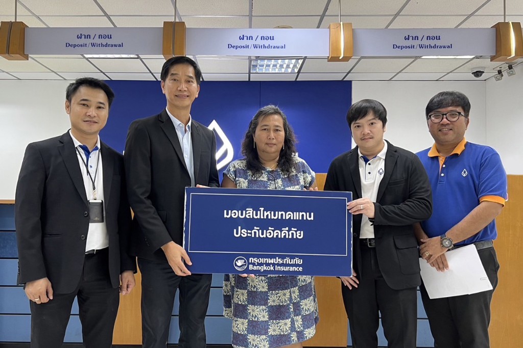 บริษัท กรุงเทพประกันภัย จำกัด (มหาชน) โดยนายประยูร แน่งน้อย (ที่ 2 จากซ้าย) ผู้จัดการสาขารังสิต ธุรกิจสาขาและการร่วมทุน เป็นผู้แทนบริษัทฯ มอบสินไหมทดแทนประกันอัคคีภัย จำนวนเงิน 5,012,040.96 บาท (ห้าล้านหนึ่งหมื่นสองพันสี่สิบบาทเก้าสิบหกสตางค์) ให้แก่นางสาวนวภัทร์ ศิริมังคะโร (กลาง) ผู้แทนรับมอบ ซึ่งเป็นภรรยาของนายอัศนีย์ นิลสัย เจ้าของบริษัท เอ็น แอนด์ เอ็น เปเปร์ จำกัด ผู้เอาประกันภัย จากกรณีไฟไหม้โรงขยะของบริษัทได้รับความเสียหาย โดยมีนายวรปรัชญ์ เนตรเอี่ยมภูมิ (ซ้ายสุด) ผู้จัดการธนาคารกรุงเทพ สาขาประตูน้ำพระอินทร์ และนายณัฐดนัย วงษ์วานิช (ที่ 2 จากขวา) ผู้จัดการธุรกิจสัมพันธ์ ธนาคารกรุงเทพ สาขาประตูน้ำพระอินทร์ ร่วมเป็นสักขีพยาน ณ ธนาคารกรุงเทพ สาขาประตูน้ำพระอินทร์ จังหวัดพระนครศรีอยุธยา เมื่อวันที่ 26 กันยายน 2566