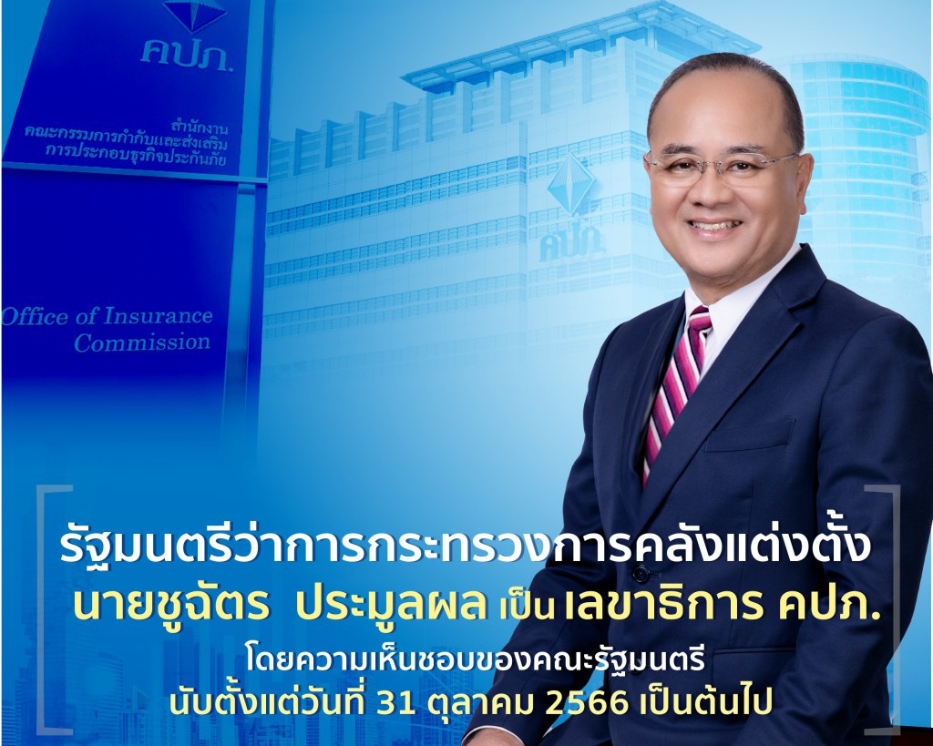 สำนักงานคณะกรรมการกำกับและส่งเสริมการประกอบธุรกิจประกันภัย (สำนักงาน คปภ.) เปิดเผยว่า เมื่อวันที่ 3 ตุลาคม 2566 คณะรัฐมนตรีมีมติเห็นชอบตามที่รัฐมนตรีว่าการกระทรวงการคลังเสนอแต่งตั้ง นายชูฉัตร ประมูลผล เป็นเลขาธิการคณะกรรมการกำกับและส่งเสริมการประกอบธุรกิจประกันภัย (เลขาธิการ คปภ.) คนใหม่ นับตั้งแต่วันที่ 31 ตุลาคม 2566 เป็นต้นไป และเมื่อวันที่ 27 ตุลาคม 2566 รัฐมนตรีว่าการกระทรวงการคลัง ได้ลงนามคำสั่งกระทรวงการคลัง แต่งตั้งเลขาธิการคณะกรรมการกำกับและส่งเสริมการประกอบธุรกิจประกันภัย เป็นที่เรียบร้อยแล้ว นับเป็นเลขาธิการ คปภ. คนที่ 4 ถัดจาก ดร. สุทธิพล ทวีชัยการ ซึ่งดำรงตำแหน่งมาตั้งแต่วันที่ 31 ตุลาคม 2558 และครบวาระการดำรงตำแหน่งสมัยที่สองเมื่อวันที่ 30 ตุลาคม 2566 ที่ผ่านมา