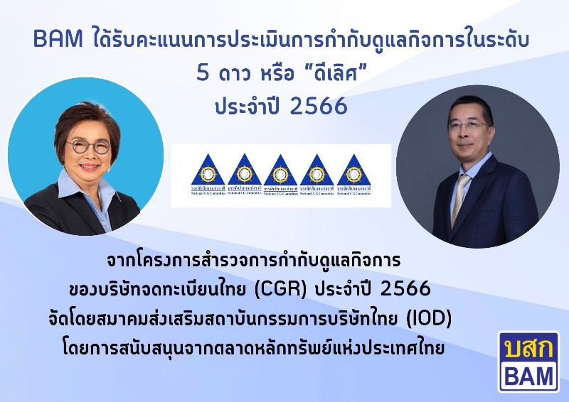 บริษัทบริหารสินทรัพย์ กรุงเทพพาณิชย์ จำกัด (มหาชน) หรือ BAM เป็นองค์กรหลักในการ พลิกฟื้นสินทรัพย์เพื่อช่วยขับเคลื่อนเศรษฐกิจและสังคมไทยให้เติบโตอย่างยั่งยืน ได้รับการประเมินการกำกับดูแลกิจการ (CGR) ประจำปี 2566 ในระดับ 5 ดาว หรือ “ดีเลิศ” ต่อเนื่องเป็นปีที่ 2 จากสมาคมส่งเสริมสถาบันกรรมการบริษัทไทย (IOD) โดยการสนับสนุนจากตลาดหลักทรัพย์แห่งประเทศไทย ซึ่งมีบริษัทจดทะเบียนเข้าร่วมการประเมินรวมทั้งสิ้น 782 บริษัท และยังได้รับการรับรองต่ออายุครั้งที่ 2 ของการเป็นสมาชิกแนวร่วมต่อต้านคอร์รัปชันของภาคเอกชนไทย (CAC)