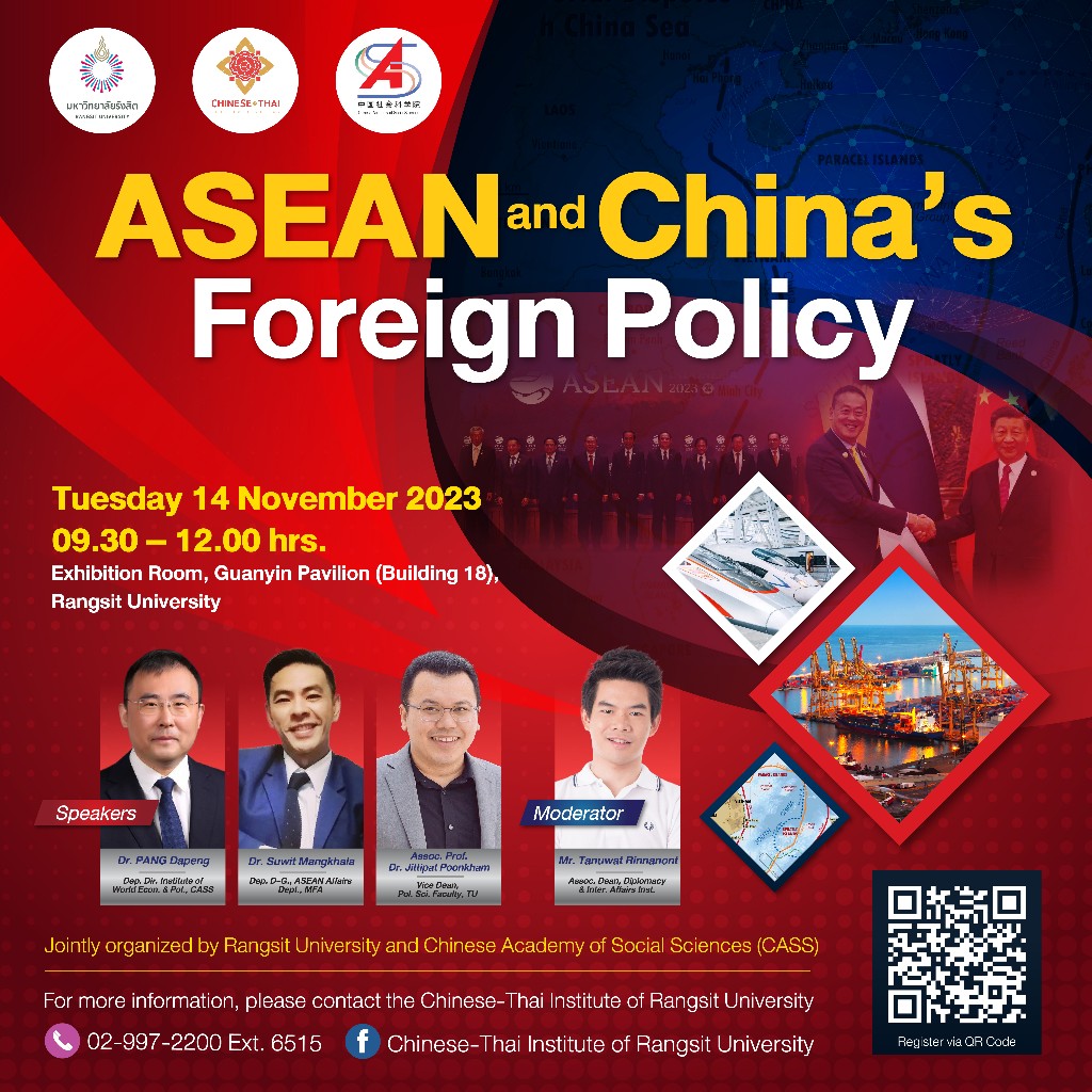สถาบันจีน-ไทย แห่งมหาวิทยาลัยรังสิต ร่วมด้วย Chinese Academy of Social Science (CASS) จัดสัมมนาเรื่อง “China and ASEAN in the Profound Changes in Geopolitics” ในวันอังคารที่ 14 พฤศจิกายน 2566 เวลา 09.30 น. – 12.00 น. ณ ศาลากวนอิม (อาคาร 18) มหาวิทยาลัยรังสิต สำหรับผู้ที่สนใจสามารถสอบถามรายละเอียดได้ที่ สถาบันจีน-ไทย แห่งมหาวิทยาลัยรังสิต