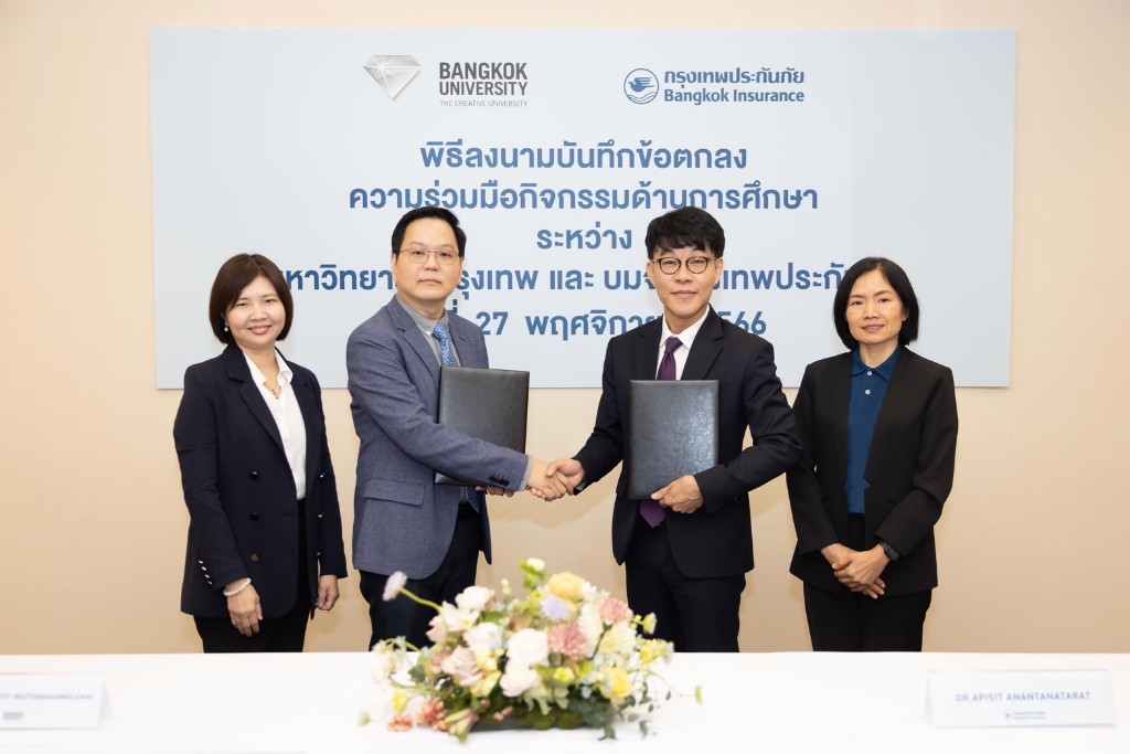 บริษัท กรุงเทพประกันภัย จำกัด (มหาชน) โดยดร.อภิสิทธิ์ อนันตนาถรัตน (ที่ 2 จากขวา) ประธานคณะผู้บริหารและกรรมการผู้อำนวยการใหญ่ และมหาวิทยาลัยกรุงเทพ โดยผศ.ดร.สมยศ วัฒนากมลชัย (ที่ 2 จากซ้าย) รองอธิการบดีสายนานาชาติ ร่วมลงนามบันทึกข้อตกลงความร่วมมือกิจกรรมด้านการศึกษา เพื่อพัฒนาองค์ความรู้และเสริมสร้างทักษะและประสบการณ์ให้แก่นักศึกษาให้ได้รับความรู้อย่างครอบคลุมในทุกๆ ด้าน ทั้งหลักสูตรวิชาการที่จำเป็น กิจกรรมเชิงปฏิบัติการต่างๆ รวมถึงการต่อยอดการเรียนรู้สู่ภาคอุตสาหกรรมประกันภัย ผ่านกิจกรรมต่างๆ อาทิ กิจกรรมฝึกงานประจำปีการศึกษาในโครงการ BKI Internship การสนับสนุนกิจกรรมต่างๆ ของนักศึกษาในโครงการ BKI Give และการร่วมสนับสนุนการผลิตบัณฑิตผ่านการสอนและการบรรยายพิเศษต่างๆ โดยบุคลากรผู้เชี่ยวชาญอย่างมืออาชีพจากกรุงเทพประกันภัยมาร่วมแบ่งปันความรู้และประสบการณ์ในภาคธุรกิจประกันภัย ความร่วมมือดังกล่าวเป็นการต่อยอดศักยภาพทางด้านการศึกษาให้มีความแข็งแกร่ง มุ่งสู่การพัฒนาสังคมและเศรษฐกิจให้เติบโตอย่างยั่งยืน ณ อาคารกรุงเทพประกันภัย ถนนสาทรใต้ เมื่อวันที่ 27 พฤศจิกายน2566