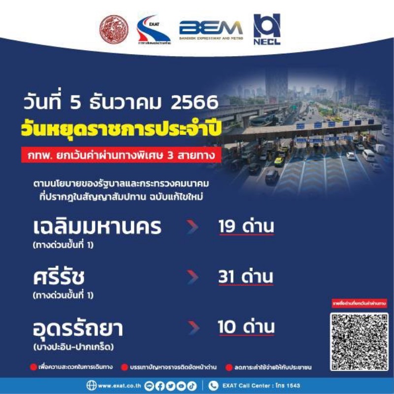 การทางพิเศษแห่งประเทศไทย (กทพ.) กระทรวงคมนาคม ยกเว้นค่าผ่านทางพิเศษของทางพิเศษ รวม 3 สายทาง ดังนี้ ทางพิเศษเฉลิมมหานคร (ทางด่วนขั้นที่ 1) จำนวน 19 ด่าน ทางพิเศษศรีรัช (ทางด่วนขั้นที่ 2) จำนวน 31 ด่าน และทางพิเศษอุดรรัถยา (บางปะอิน-ปากเกร็ด) จำนวน 10 ด่าน ในวันอังคารที่ 5 ธันวาคม 2566 (วันคล้ายวันพระราชสมภพของพระบาทสมเด็จพระบรมชนกาธิเบศร มหาภูมิพลอดุลยเดชมหาราชบรมนาถบพิตร) ตั้งแต่เวลา 00.01 น. ถึง 24.00 น. ซึ่งเป็นวันหยุดราชการประจำปีตามประกาศสำนักนายกรัฐมนตรี