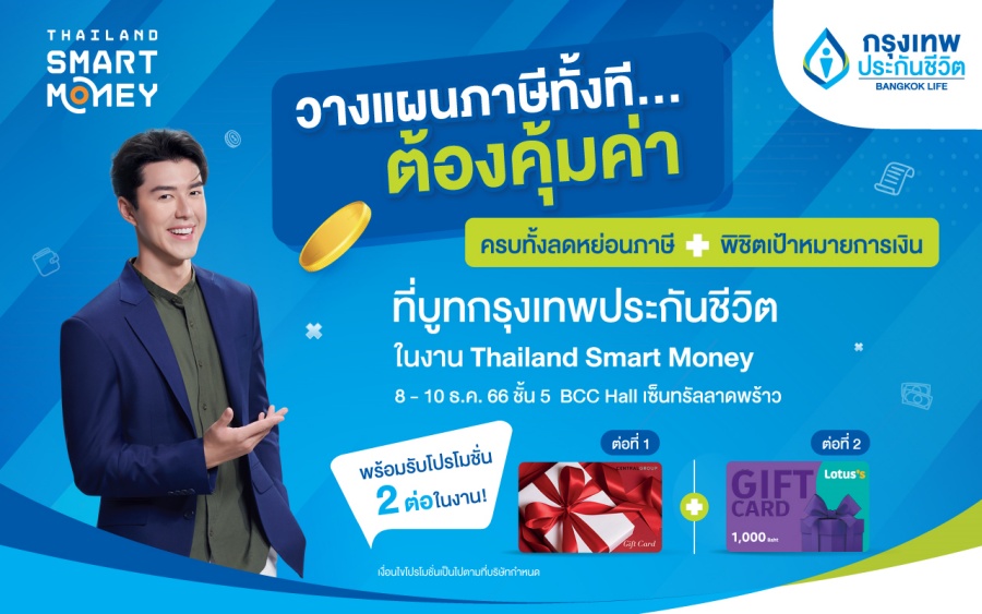 วางแผนการเงิน-ลดหย่อนภาษี ครบรอบด้านพร้อมรับโปรโมชั่นสุดคุ้ม ในเทศกาลการเงิน-การลงทุน “Thailand Smart Money” กรุงเทพฯ ครั้งที่ 14 ที่บูทกรุงเทพประกันชีวิต ชั้น 5 บีซีซี ฮอลล์ ศูนย์การค้าเซ็นทรัล ลาดพร้าว ระหว่างวันที่ 8-10 ธันวาคม 2566 และสามารถติดตามรายละเอียดเพิ่มเติมของแบบประกันต่างๆ ได้ที่เว็บไซต์กรุงเทพประกันชีวิต http://www.bangkoklife.com หรือติดต่อ Call Center โทร. 02-777-8888