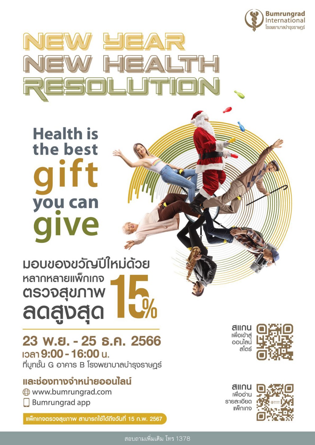 โรงพยาบาลบำรุงราษฎร์ ห่วงใยสุขภาพประชาชน จัดหลากหลายแพ็กเกจตรวจสุขภาพลดสูงสุด 15 % เพื่อให้คุณมอบเป็นของขวัญให้คนที่คุณรักในช่วงเทศกาลปีใหม่นี้ ภายใต้คอนเซ็ปต์ New Year New Health Resolution โดยผู้ที่สนใจสามารถหาซื้อแพ็กเกจได้ที่บูทชั้น G อาคาร B โรงพยาบาลบำรุงราษฎร์ ตั้งแต่วันนี้ – 25 ธ.ค. 2566 เวลา 9:00 – 16:00 น. และช่องทางจำหน่ายออนไลน์ http://www.bumrungrad.com หรือ Bumrungrad app โดยแพ็กเกจตรวจสุขภาพ สามารถใช้ได้ถึงวันที่ 15 ก.พ. 2567 สอบถามข้อมูลเพิ่มเติม โทร 1378