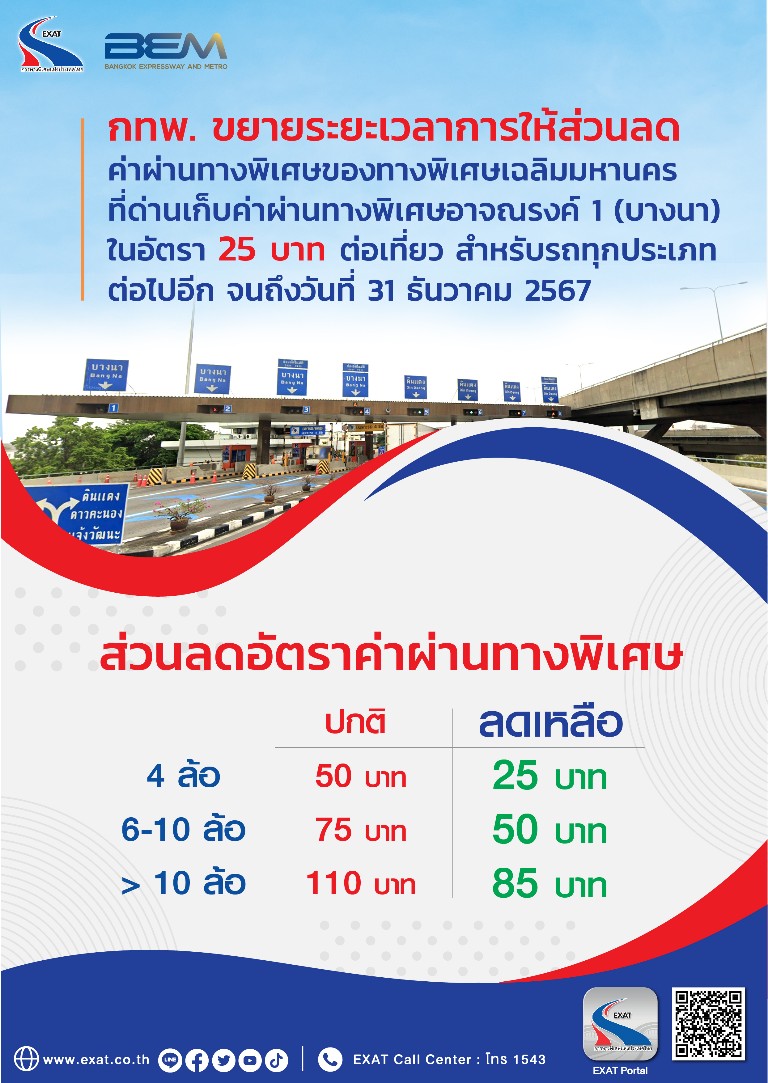 โดยขยายระยะเวลาการให้ส่วนลดต่อไปอีก ตั้งแต่วันที่ 1 มกราคม 2567 – 31 ธันวาคม 2567 หลังจากก่อนหน้านี้ได้ลดราคามาแล้วตั้งแต่วันที่ 1 กรกฎาคม 2564 จนถึงวันที่ 31 ธันวาคม 2566ติดต่อสอบถามข้อมูลเพิ่มเติมได้ที่ ศูนย์บริการข้อมูลผู้ใช้ทางพิเศษ (EXAT Call Center) โทร 1543 ได้ตลอด 24 ชั่วโมง
