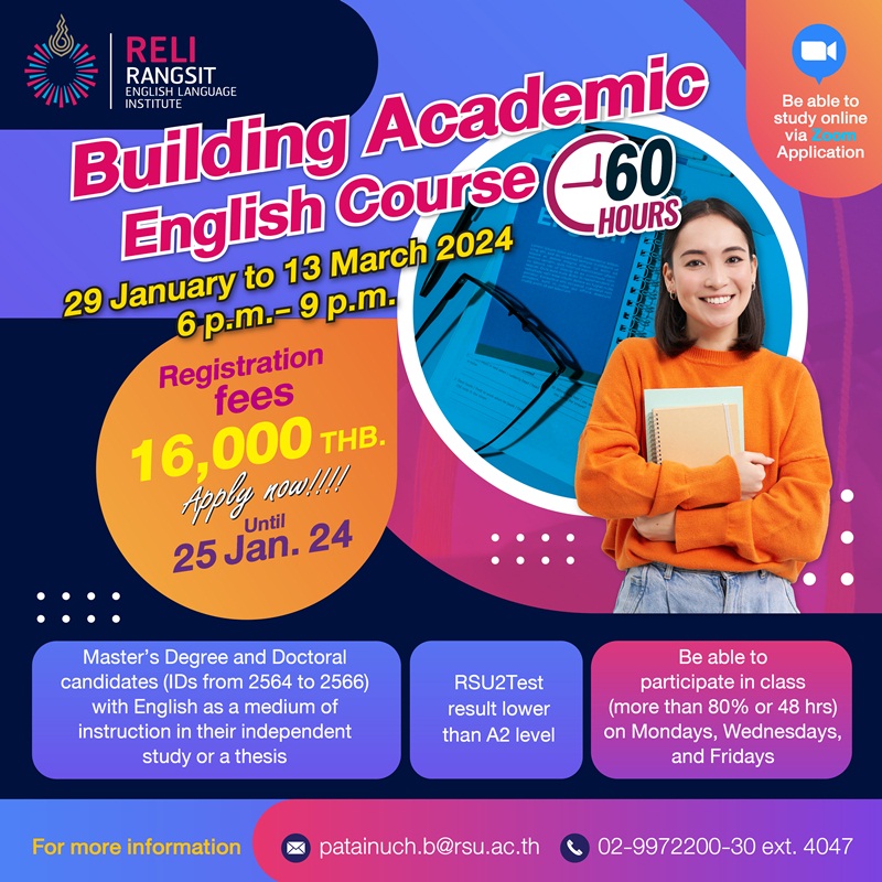 2. หลักสูตร Developing Academic English อบรมทุกวันจันทร์ วันพุธ และวันศุกร์ เวลา 18.00- 21.00 น. เริ่มอบรมตั้งแต่วันจันทร์ที่ 18 มีนาคม – วันศุกร์ที่ 19 เมษายน 2567 (9 ชั่วโมงต่อสัปดาห์ รวมเป็น 45 ชั่วโมง) รูปแบบการเรียนการสอนผ่าน video conference