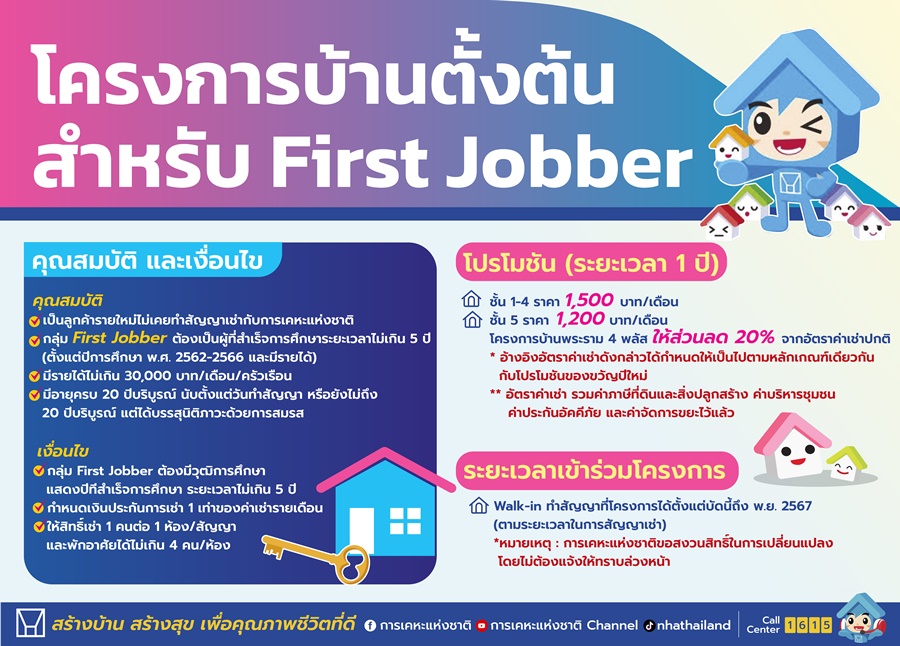 คุณสมบัติของกลุ่ม First Jobber และประชาชนที่สนใจ จะต้องเป็นผู้จบการศึกษาใหม่ และเป็นลูกค้ารายใหม่ที่ไม่เคยทำสัญญากับการเคหะแห่งชาติ มีรายได้ไม่เกิน 30,000 บาท/เดือน/ครัวเรือน ให้สิทธิเช่า 1 คน/1 ห้อง/สัญญา และขนาดครอบครัวไม่เกิน 4 คน/ห้อง พร้อมกำหนดเงินประกันการเช่า 1 เท่าของค่าเช่ารายเดือน (รวมค่าประกันมิเตอร์น้ำประปา-ไฟฟ้าแล้ว)