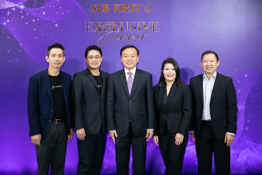 ดร.ยรรยง ไทยเจริญ (กลาง) รองผู้จัดการใหญ่อาวุโส ประธานเจ้าหน้าที่บริหารกลุ่มธุรกิจ WEALTH ธนาคารไทยพาณิชย์ นำทีมผู้บริหารจัดงาน SCB First Exclusive Dinner ให้แก่กลุ่มลูกค้า First เพื่อเปิดมุมมองวิเคราะห์เจาะลึกภาพรวมเศรษฐกิจ การลงทุนระดับโลก พร้อมกลยุทธ์การเลือกสินทรัพย์ลงทุนเพื่อต่อยอดความมั่งคั่ง ในปี 2024 โดยมี นายศรชัย สุเนต์ตา (ที่ 1 ขวา) ผู้ช่วยผู้จัดการใหญ่ผู้บริหารสายงาน Investment Office and Product กลุ่มธุรกิจ Wealth ธนาคารไทยพาณิชย์ คุณรัฐยา ทองรัตน์ (ที่ 2 ขวา) ผู้ช่วยผู้จัดการใหญ่ ผู้บริหารสายงาน Wealth Strategy and Enablement ธนาคารไทยพาณิชย์ คุณนายสุกิจ อุดมศิริกุล (ที่ 1 ซ้าย) กรรมการผู้จัดการ สายงานวิจัย บริษัทหลักทรัพย์ อินโนเวสท์ เอกซ์ จำกัด และ ดร.กำพล อดิเรกสมบัติ (ที่2ซ้าย) ผู้อำนวยการอาวุโสและหัวหน้าทีม SCB Chief Investment Office (SCB CIO) ธนาคารไทยพาณิชย์ ร่วมงานสัมมนา ณ โรงแรม แบงค็อก แมริออท เดอะ สุรวงศ์ เมื่อเร็วๆนี้