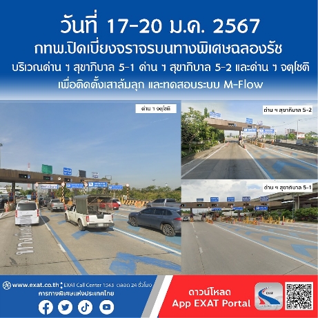 ทั้งนี้ การทางพิเศษ ฯ กำหนดเปิดให้บริการ M-Flow ภายในเดือนพฤษภาคม 2567 ซึ่งผู้ใช้บริการทางพิเศษสามารถลงทะเบียนและอัปเดต Easy Pass เป็น Easy Pass Plus เพื่อใช้งานในระบบ M-Flow ได้ที่ www.thaieasypass.com หรือ Application EXATPortal กทพ. ต้องขออภัยในความไม่สะดวกมา ณ โอกาสนี้ และขอความร่วมมือผู้ที่ใช้เส้นทางบริเวณดังกล่าวโปรดสังเกตป้ายเตือน สัญญาณจราจรต่างๆ และปฏิบัติตามเครื่องหมายจราจรอย่างเคร่งครัด เพื่อความปลอดภัยของผู้ใช้บริการทางพิเศษ