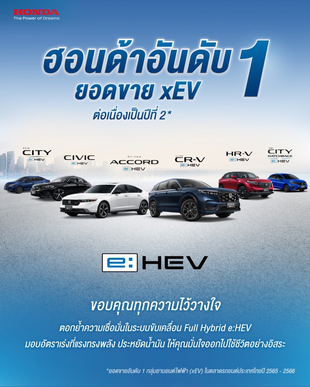 ขอขอบคุณทุกความไว้วางใจจากลูกค้าที่มีต่อแบรนด์ฮอนด้า ส่งผลให้ฮอนด้ายังคงครองอันดับ 1 ยอดขายกลุ่ม xEV ในตลาดรถยนต์ประเทศไทย ตอกย้ำความเชื่อมั่นในระบบขับเคลื่อนฟูลไฮบริด e:HEV ที่มอบอัตราเร่งที่แรง ทรงพลัง ประหยัดน้ำมันดีเยี่ยม เพื่อให้ออกไปใช้ชีวิตอย่างอิสระด้วยความมั่นใจ โดยฮอนด้าจะยังคงมุ่งมั่นพัฒนาและนำเสนอผลิตภัณฑ์ที่มีคุณภาพ และรักษามาตรฐานการบริการผ่านเครือข่ายโชว์รูมและศูนย์บริการทั่วประเทศต่อไป