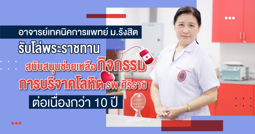 อาจารย์เทคนิคการแพทย์ มหาวิทยาลัยรังสิต รับรางวัลโล่พระราชทานจากพระบาทสมเด็จพระวชิรเกล้าเจ้าอยู่หัว รัชกาลที่ 10 ในโอกาสสนับสนุนช่วยเหลือกิจกรรมการบริจาคโลหิต โรงพยาบาลศิริราช ต่อเนื่องกว่า 10 ปี