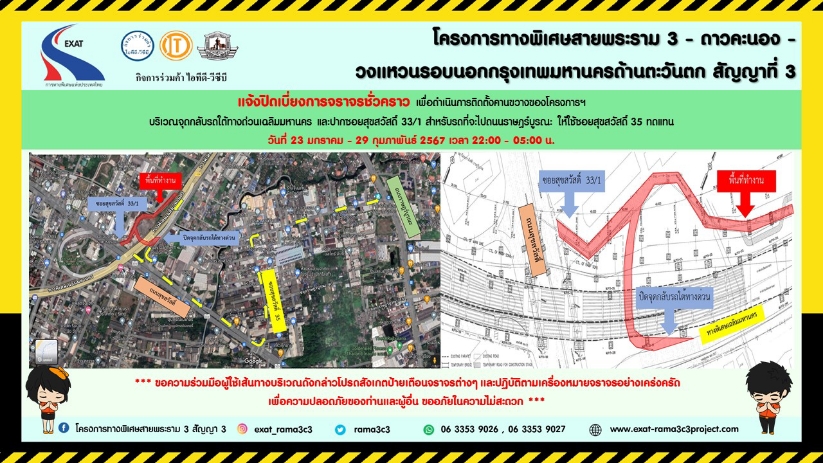 การทางพิเศษแห่งประเทศไทย (กทพ.) กระทรวงคมนาคมได้ว่าจ้าง กิจการร่วมค้า ไอทีดี-วีซีบี (ITD-VCB Joint Venture) ประกอบด้วย บริษัท อิตาเลียนไทย ดีเวล๊อปเมนต์ จำกัด (มหาชน) และบริษัท วิจิตรภัณฑ์ก่อสร้าง จำกัด เป็นผู้รับจ้างผู้ดําเนินการก่อสร้าง โครงการทางพิเศษสายพระราม3 – ดาวคะนอง – วงแหวนรอบนอกกรุงเทพมหานครด้านตะวันตกสัญญาที่ 3 แจ้งการปิดเบี่ยงการจราจรชั่วคราวชั่วคราวบริเวณจุดกลับรถใต้ทางพิเศษเฉลิมมหานคร และปากซอยสุขสวัสดิ์ 33/1 ตั้งแต่วันที่ 23 มกราคม – 29 กุมภาพันธ์ 2567 เวลา 22.00-05.00 น สำหรับรถที่จะไปราษฎร์บูรณะให้ใช้ซอยสุขสวัสดิ์ 35 ทดแทน