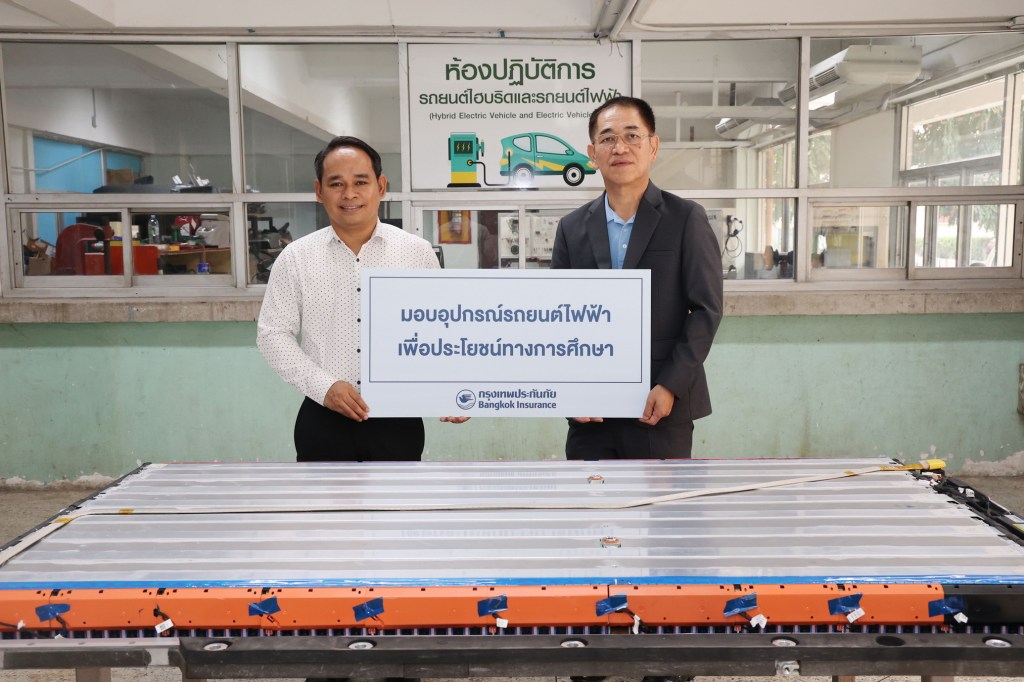 บริษัท กรุงเทพประกันภัย จำกัด (มหาชน) ให้ความสำคัญกับการพัฒนาบุคลากรด้วยการสนับสนุนการให้ความรู้และความชำนาญด้านเทคโนโลยียานยนต์ไฟฟ้า ให้สามารถตอบสนองความต้องการในธุรกิจยานยนต์อย่างยั่งยืน โดยนายยิ่งยศ แสงชัย (ขวา) ผู้อำนวยการ ฝ่ายสินไหมทดแทนยานยนต์ เป็นผู้แทนบริษัทฯ มอบแบตเตอรี่รถยนต์ไฟฟ้า ขนาด 60.48 kWh จำนวน 1 แพ็ก ให้แก่คณะวิศวกรรมศาสตร์และสถาปัตยกรรมศาสตร์ มหาวิทยาลัยเทคโนโลยีราชมงคลสุวรรณภูมิ ซึ่งเป็นศูนย์ทดสอบมาตรฐานฝีมือแรงงาน สาขาช่างซ่อมบำรุงรถยนต์ไฟฟ้า และศูนย์การศึกษาและฝึกอบรมยานยนต์ไฟฟ้าของกรมพัฒนาฝีมือแรงงาน กระทรวงแรงงาน