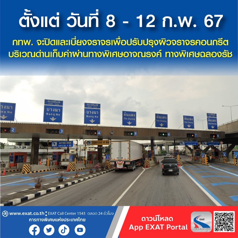 การทางพิเศษแห่งประเทศไทย (กทพ.) กระทรวงคมนาคม ได้ว่าจ้าง บริษัท คลีโนลซอล ทราฟฟิค(ประเทศไทย) จำกัด ดำเนินงานก่อสร้างปรับปรุงผิวจราจรคอนกรีตช่องเก็บค่าผ่านทางพิเศษฉลองรัช บริเวณด่านเก็บค่าผ่านทางพิเศษอาจณรงค์ จึงมีความจำเป็นจะต้องปิดและเบี่ยงจราจรบริเวณด่านเก็บค่าผ่านทางพิเศษดังกล่าว ตั้งแต่วันที่ 8 – 12 กุมภาพันธ์ 2567 เวลา 00.00 – 24.00 น. ในการนี้ กทพ. ได้มีการติดตั้งป้ายเตือนก่อนถึงพื้นที่ดำเนินการและติดตั้งไฟสัญญาณต่าง ๆ ป้ายประชาสัมพันธ์การเบี่ยงการจราจรพร้อมไฟวับวาบเพื่อให้สัญญาณแก่ผู้ใช้ทางพิเศษทราบล่วงหน้า