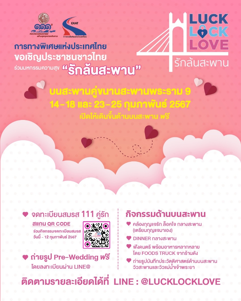การทางพิเศษแห่งประเทศไทย (กทพ.) ร่วมฉลองครบรอบ 111 ปี กระทรวงคมนาคม ชวนคนไทยร่วมงาน “Luck Lock Love รักล้นสะพาน” ในระหว่างวันที่ 14 – 18 และ 23 – 25 กุมภาพันธ์ 2567 ฉลองวาเลนไทน์ลอยฟ้าครั้งประวัติศาสตร์ บนสะพานคู่ขนานสะพานพระราม 9 โดยไฮไลท์พิเศษ คือ การจดทะเบียนสมรส 111 คู่รัก บนสะพานคู่ขนานสะพานพระราม 9 ในวันที่ 14 กุมภาพันธ์ 2567 พร้อมลุ้นรับของขวัญสุดพิเศษ สำหรับงาน “Luck Lock Love รักล้นสะพาน” ฉลองวันแห่งความรักลอยฟ้าบนสะพานคู่ขนานสะพานพระราม 9 จะจัดขึ้นตั้งแต่วันที่ 14 – 18 กุมภาพันธ์ 2567 ถือเป็นครั้งแรกที่เปิดโอกาสให้ประชาชนได้ขึ้นไปสัมผัสถึงความยิ่งใหญ่และสง่างามของสะพานคู่ขนานสะพานพระราม 9 ซึ่งถือว่าเป็นสะพานขึงเสาข้ามแม่น้ำเจ้าพระยาคู่แรกของประเทศไทย ที่โดดเด่นด้วยเทคโนโลยีการก่อสร้างสะพานขั้นสูง และเป็นสะพานข้ามแม่น้ำที่กว้างที่สุดในประเทศไทย รองรับการสัญจร 8 ช่องทางจราจร นอกจากนี้ ภายในงาน “Luck Lock Love รักล้นสะพาน” ทุกคนจะได้พบกับกิจกรรมที่อบอวลไปด้วยบรรยากาศแห่งความสุขมากมาย ทั้งการแสดงดนตรีที่จะมาสร้างความสุข อาหารจากร้านค้าชื่อดัง และกิจกรรม street show ที่เติมเต็มความสนุกสนานให้กับทุกคนที่เข้าร่วมงาน
