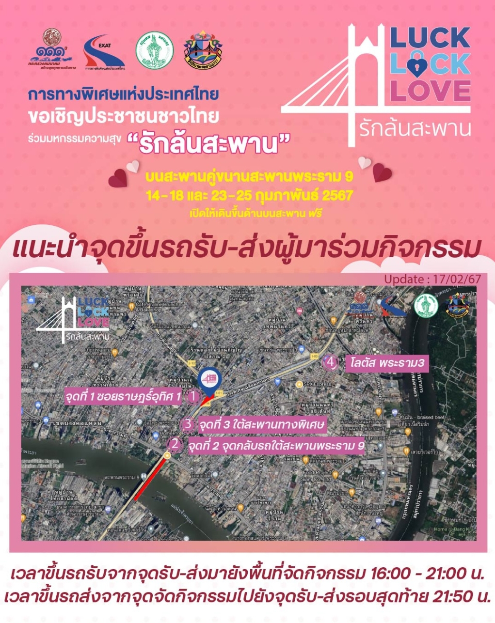 สำหรับประชาชนที่สนใจร่วมเป็นส่วนหนึ่งของมหกรรมแห่งความสุข “Luck Lock Love รักล้นสะพาน” ซึ่งจัดขึ้นตั้งแต่วันที่ 14 – 18 และ 23 – 25 กุมภาพันธ์ 2567 ควรเตรียมตัวให้พร้อมกับการเดินขึ้น-ลงสะพาน ระยะทางรวม 3 กิโลเมตร โดยไม่อนุญาตให้ยานพาหนะทุกชนิดขึ้นบนสะพาน หรือนำมาจอดในบริเวณงาน ยกเว้นรถที่ใช้ในกรณีฉุกเฉินเท่านั้น รวมถึงห้ามนำสัตว์ทุกชนิดขึ้นมาบนสะพาน ห้ามสูบบุหรี่ทุกประเภท และห้ามเครื่องดื่มมึนเมา เครื่องดื่มแอลกอฮอล์ และพกพาอาวุธทุกชนิด สอบถามข้อมูลเพิ่มเติมที่ LINE : @LUCKLOCKLOVE