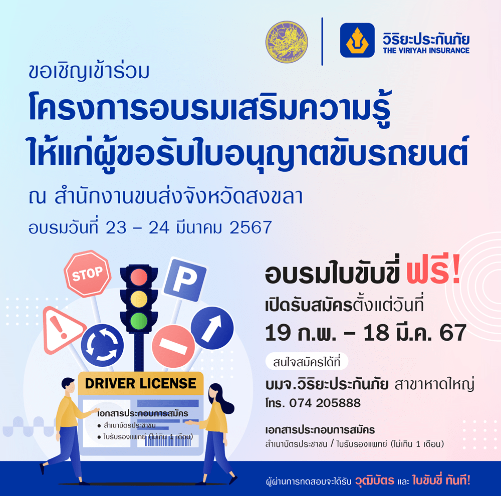 บริษัท วิริยะประกันภัย จำกัด (มหาชน) ร่วมกับ กรมการขนส่งทางบก เชิญชวนนักขับขี่มือใหม่ชาวสงขลา และจังหวัดใกล้เคียง สมัครเข้าร่วมโครงการ “อบรมเสริมความรู้ให้แก่ผู้ขอรับใบอนุญาตขับรถยนต์” ประจำปี 2567 ซึ่งบริษัทจัดขึ้นเพื่อเสริมสร้างวินัยจราจรความรู้ความเข้าใจเกี่ยวกับการขับขี่รถยนต์อย่างปลอดภัย รวมถึงอำนวยความสะดวกให้แก่ผู้ที่ต้องการขอรับใบอนุญาตขับรถยนต์ ซึ่งการอบรมฯ รุ่นแรกของปี จัดขึ้นในวันที่ 23 – 24 มีนาคม 2567 ณ สำนักงานขนส่งจังหวัดสงขลา (เปิดรับสมัครตั้งแต่วันที่ 19 กุมภาพันธ์ – 18 มีนาคม 2567)