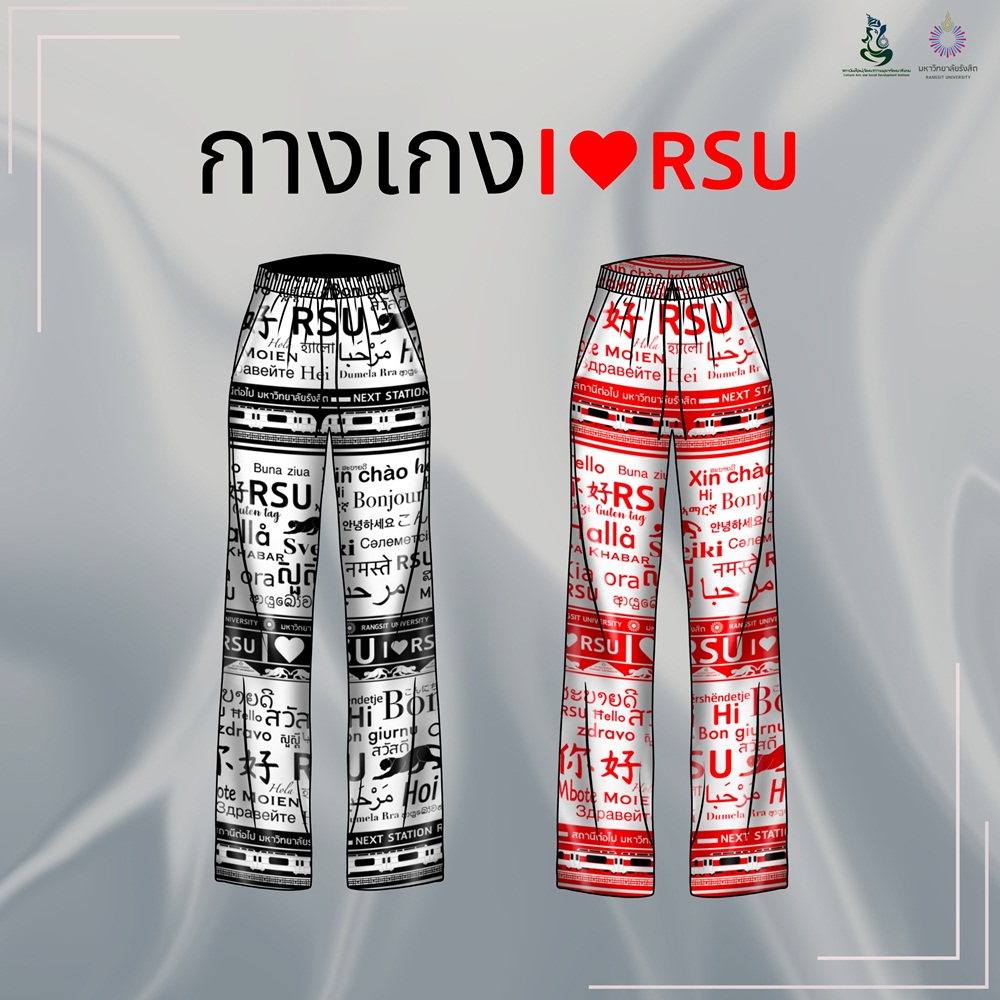 มหาวิทยาลัยรังสิต เปิดตัวคอลเลคชั่นกางเกงอินเทรนด์แฟชั่นปัจจุบัน โดยมีการสร้างลวดลายเป็นลิขสิทธิ์ ผลงานการออกแบบโดยนักศึกษา นำเสนอผ่านเอกลักษณ์ เรื่องราว และเสน่ห์ความเป็นมหาวิทยาลัยรังสิต ผ่านลายผ้าบนกางเกง โดยเรื่องราวนำเสนอภายใต้คอนเซ็ปต์ “ทุกคนต่างมีมหาวิทยาลัยรังสิตเป็นของตัวเอง เมื่อคิดถึงมหาวิทยาลัยรังสิต คุณคิดถึงอะไรบ้าง” ดังนี้