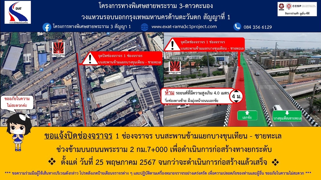 ช่องจราจร 1 ช่องจราจร บนสะพานข้ามแยกบางขุนเทียน –ชายทะเล ช่วงข้ามบนถนนพระราม 2 กม.7+000 ตั้งแต่วันที่ 25 พฤษภาคม 2567 จนกว่าจะดำเนินการก่อสร้างแล้วเสร็จ