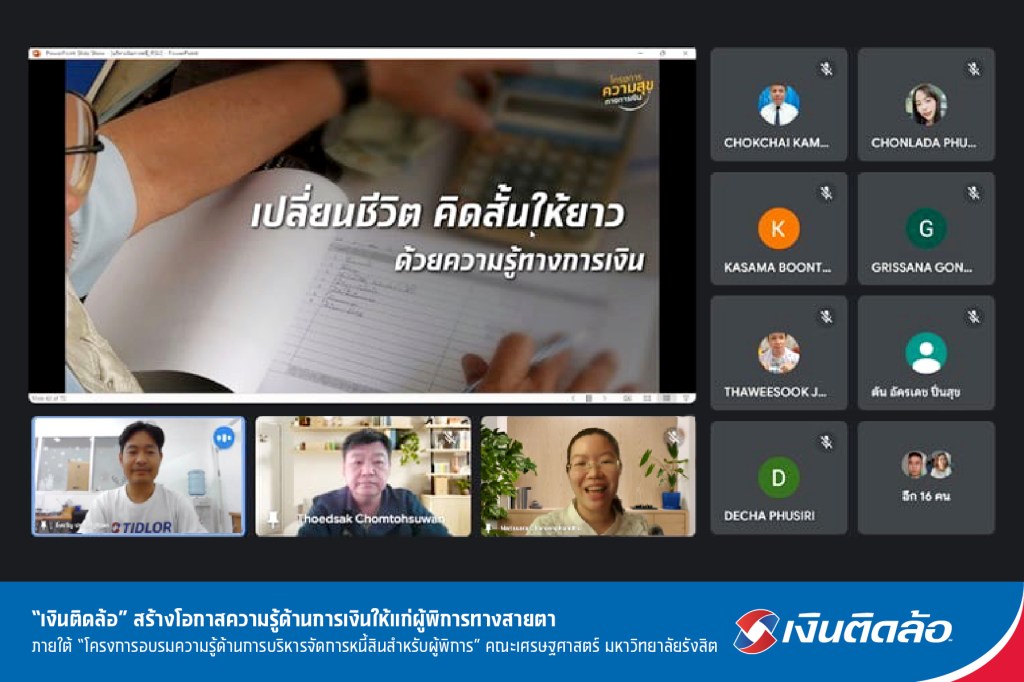 บริษัท เงินติดล้อ จำกัด (มหาชน) หรือ TIDLOR โดย นายมิ่งขวัญ ประเสริฐศิวพร ผู้ช่วยผู้จัดการ งานส่งเสริมการเรียนรู้ด้านการเงิน ร่วมกับ คณะเศรษฐศาสตร์ มหาวิทยาลัยรังสิต จัดกิจกรรมให้ความรู้ด้านการเงิน ภายใต้โครงการบริการวิชาการ แบบให้เปล่า “โครงการอบรมความรู้ด้านการบริหารจัดการหนี้สินสำหรับผู้พิการ” แก่นักศึกษาผู้พิการทางด้านสายตาและด้านการเคลื่อนไหว จำนวน 24 คน มีวัตถุประสงค์เพื่อให้ความรู้ความเข้าใจเกี่ยวกับหนี้สินและแนวทางการบริหารจัดการหนี้สินของตนเองได้อย่างมีประสิทธิภาพ เพื่อเป็นการช่วยเพิ่มพูนความรู้และส่งเสริมคุณภาพชีวิตที่ดีขึ้นให้แก่ผู้พิการ โดยได้รับเกียรติจาก ผศ. ดร.เทอดศักดิ์ ชมโต๊ะสุวรรณ รองคณบดีฝ่ายวิชาการ และ ดร.นริศรา เจริญพันธุ์ หัวหน้าหลักสูตรเศรษฐศาสตรบัณฑิต สาขาวิชาเศรษฐกิจดิจิทัล คณะเศรษฐศาสตร์ มหาวิทยาลัยรังสิต เข้าร่วมเป็นวิทยากรในกิจกรรมอย่างใกล้ชิด ทั้งนี้ กิจกรรมดังกล่าวสะท้อนถึงความมุ่งมั่นตั้งใจของเงินติดล้อในการสร้างโอกาสทางการเงินที่ยั่งยืนให้กับผู้คนในสังคมไทย กิจกรรมจัดขึ้นในรูปแบบออนไลน์ผ่านช่องทาง Google Meet เมื่อเร็วๆ นี้