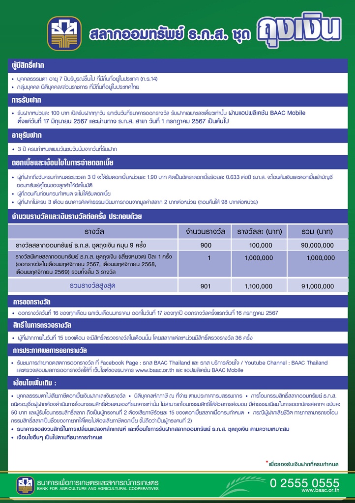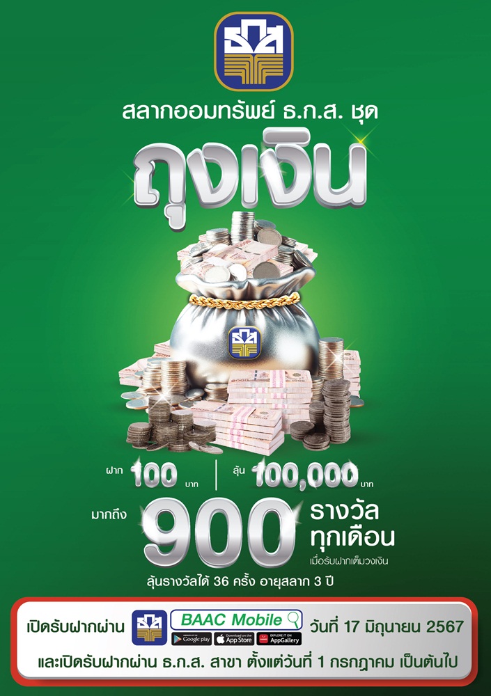 นายฉัตรชัย ศิริไล ผู้จัดการธนาคารเพื่อการเกษตรและสหกรณ์การเกษตร (ธ.ก.ส.) เปิดเผยว่า ธ.ก.ส. เปิดรับฝาก“สลากออมทรัพย์ ธ.ก.ส. ชุดถุงเงิน” รองรับเงินฝากที่ครบกำหนด โดยเพิ่มโอกาสในการออมและการลุ้นโชค แบบรวยถ้วนหน้ากับสลากถุงเงิน จำหน่ายในราคาหน่วยละ 100 บาท จำนวน 1,000 ล้านหน่วย แบ่งเป็น 100 หมวด หมวดละ 10 ล้านหน่วย วงเงินรวม 100,000 ล้านบาท อายุการรับฝาก 3 ปี เมื่อฝากครบกำหนด จะได้รับดอกเบี้ยหน่วยละ 1.90 บาท คิดเป็นอัตราดอกเบี้ยร้อยละ 0.633 ต่อปี พร้อมลุ้นรางวัลมูลค่า 100,000 บาท จำนวน 900 รางวัล ทุกเดือน จำนวน 36 ครั้ง เมื่อรับฝากสลากเต็มวงเงิน และยังมีสิทธิ์ลุ้นรางวัลพิเศษ มูลค่ารางวัลละ 1,000,000 บาท ปีละ 1 ครั้ง ในเดือนพฤศจิกายน รวมทั้งหมด 3 ครั้ง รวมมูลค่ารางวัลทั้งสิ้น 3,243 ล้านบาท จับรางวัลทุกวันที่ 16 ของเดือน ยกเว้นเดือนมกราคม ออกรางวัลในวันที่ 17 มกราคม ผู้สนใจสามารถเปิดบัญชีเงินฝาก และขึ้นทะเบียนสลากได้ที่เคาน์เตอร์ ธ.ก.ส. ทุกสาขา เพื่อป้องกันมิจฉาชีพและเพิ่มความสะดวกสบายในการซื้อสลากครั้งต่อไปแบบง่ายๆ บน มือถือ โดยจะเปิดรับฝากสลากผ่านแอปพลิเคชัน BAAC Mobile ตั้งแต่วันที่ 17 มิถุนายนนี้ และเปิดรับฝากผ่านเคาน์เตอร์ ธ.ก.ส. ทุกสาขาทั่วประเทศวันที่ 1 กรกฎาคม 2567 เป็นต้นไป และออกรางวัลครั้งแรกวันที่ 16 กรกฎาคมนี้
