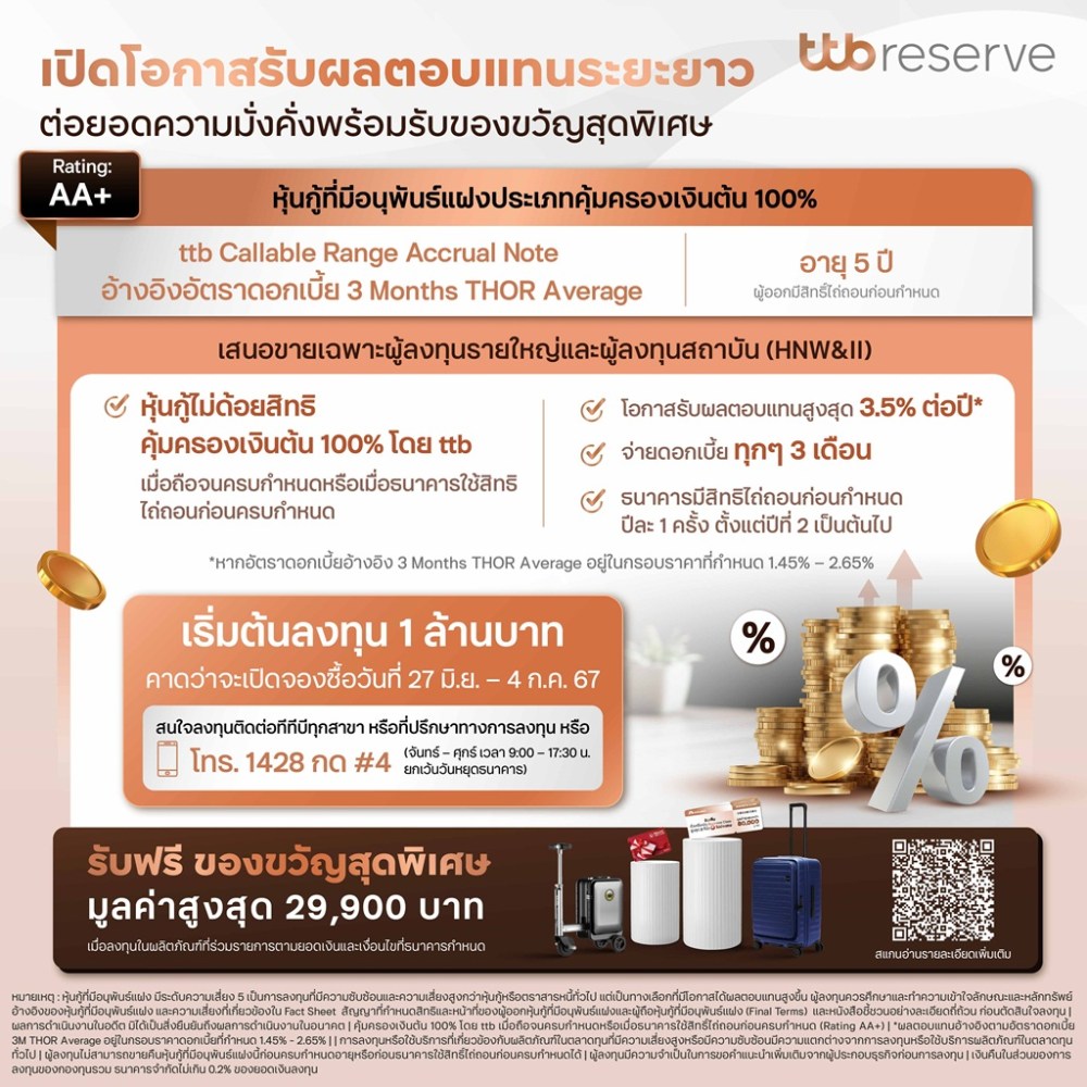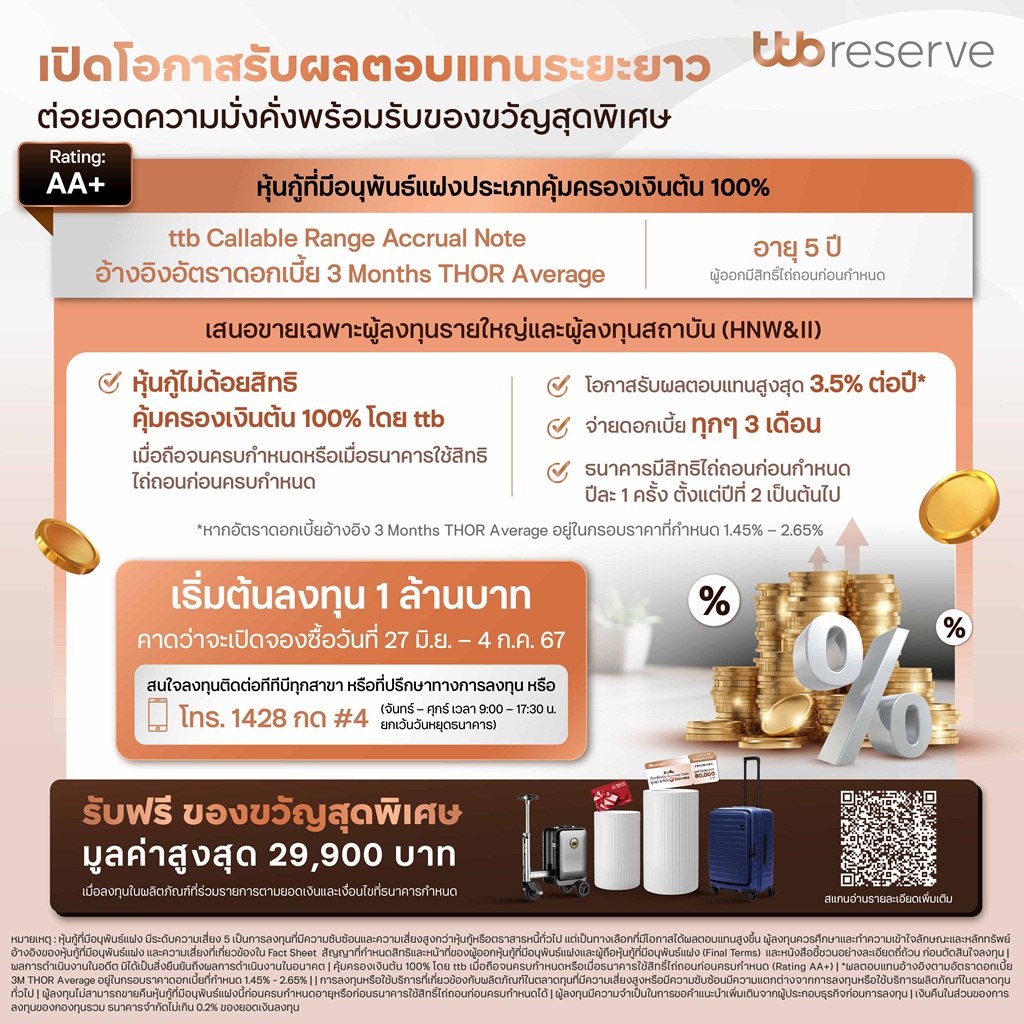 กรุงเทพฯ 27 มิถุนายน 2567 – ทีเอ็มบีธนชาต หรือ ทีทีบี เตรียมเสนอขายหุ้นกู้ที่มีอนุพันธ์แฝง ประเภท Callable Range Accrual Note อายุ 5 ปี อ้างอิงอัตราดอกเบี้ย 3M THOR Average เป็นทางเลือกในการสร้างโอกาสรับผลตอบแทนระยะยาวสูงสุดถึง 3.5% ต่อปี และคุ้มครองเงินต้น 100% เมื่อถือจนครบกำหนดหรือเมื่อธนาคารใช้สิทธิไถ่ถอนก่อนครบกำหนด เพื่อต่อยอดความมั่งคั่งในการลงทุนได้อย่างมั่นใจ เปิดจำหน่ายให้แก่ผู้ลงทุนรายใหญ่ และผู้ลงทุนสถาบัน (HNW&II) ตั้งแต่วันที่ 27 มิถุนายน – 4 กรกฎาคม 2567
