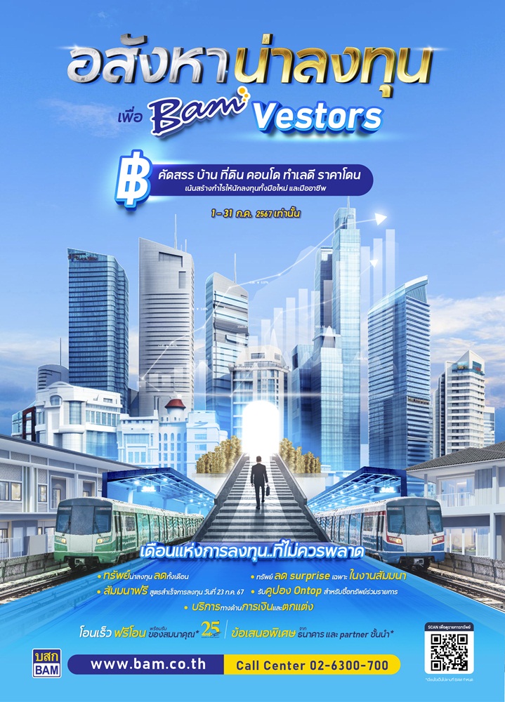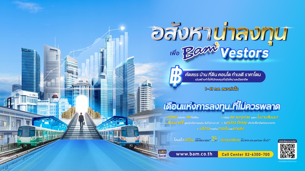 BAM จัดแคมเปญ “ อสังหาฯ น่าลงทุน เพื่อ BAMvestors ” โดยคัดอสังหาฯ หลากหลายทำเล ทั่วประเทศ ไม่ว่าจะเป็น บ้าน ที่ดิน คอนโด ทำเลดี จำนวนกว่า 2,500 รายการ มาลดราคาพิเศษนำเสนอให้นักลงทุนเลือกเป็นเจ้าของอสังหา ฯ เพื่อการลงทุนได้อย่างจุใจ ตั้งแต่วันนี้ ถึงวันที่ 31 กรกฎาคม 2567 พร้อมจัดสัมมนาฟรี เชิญ 4 วิทยากร ผู้มากด้วยความรู้ และประสบการณ์ในแวดวงธุรกิจอสังหาริมทรัพย์ มาเจาะลึกเทรนด์การลงทุน และร่วมรับฟังสูตรสำเร็จการลงทุนอสังหาฯ , การ Renovate เพื่อเพิ่มโอกาสในการขาย และทำกำไร ผู้สนใจสามารถลงทะเบียนสำรองที่นั่งได้ที่ http://www.bam.co.th