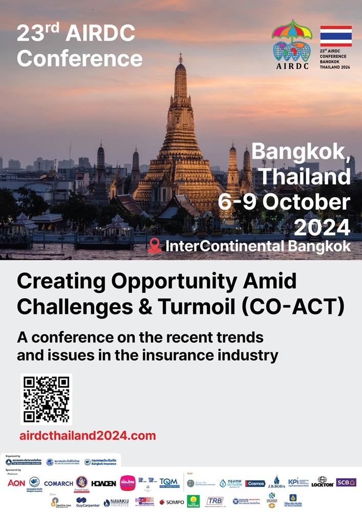 ล่าสุดเตรียมอัปเดตความรู้และทิศทางอุตสาหกรรมประกันภัยในงานประชุมระดับนานาชาติ Association of Insurers and Reinsurers of Developing Countries: AIRDC ครั้งที่ 23 ภายใต้ธีม “Creating Opportunity Amid Challenges & Turmoil (CO-ACT)” สร้างโอกาสท่ามกลางความท้าทายในสถานการณ์โลกปัจจุบัน ซึ่งในปีนี้ประเทศไทยได้รับเกียรติเป็นเจ้าภาพในการจัดงานดังกล่าวเป็นครั้งแรก ระหว่างวันที่ 6-9 ตุลาคม 2567 ณ โรงแรมอินเตอร์คอนติเนนตัล กรุงเทพฯ โดยความร่วมมือกันของสมาคมประกันวินาศภัยไทย (TGIA) สมาคมประกันชีวิตไทย (TLAA) และบริษัท กรุงเทพประกันภัย จำกัด (มหาชน) (BKI) ร่วมเป็นเจ้าภาพจัดงานการประชุมครั้งสำคัญนี้