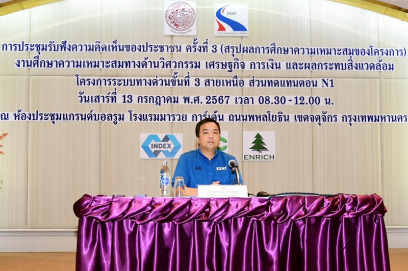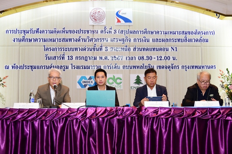 วันนี้ (13 กรกฎาคม 2567) เวลา 08.30 – 12.00 น. การทางพิเศษแห่งประเทศไทย (กทพ.)กระทรวงคมนาคมได้จัดให้มีการประชุมรับฟังความคิดเห็นของประชาชน ครั้งที่ 3 (สรุปผลการศึกษาความเหมาะสมของโครงการ) งานศึกษาความเหมาะสมทางด้านวิศวกรรม เศรษฐกิจ การเงิน และผลกระทบสิ่งแวดล้อมโครงการระบบทางด่วนขั้นที่ 3 สายเหนือ ส่วนทดแทน ตอน N1 ณ ห้องประชุมแกรนด์บอลรูมโรงแรมมารวยการ์เด้น แขวงเสนานิคม เขตจตุจักร กรุงเทพมหานคร โดยมี นายสุรเชษฐ์ เหล่าพูลสุข ผู้ว่าการการทางพิเศษแห่งประเทศไทยเป็นประธาน การประชุม