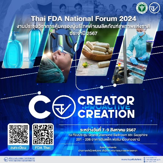 สํานักงานคณะกรรมการอาหารและยา (Thai FDA) ได้จัดงาน “CREATOR PROACIIVE CREATION” งานประชุมวิชาการคุ้มครองผู้บริโภคด้านผลิตภัณฑ์สุขภาพแห่งชาติ ประจําปี 2567 หรือ Thai FDA National Forum 2024 ณ ห้องประชุม Grand Diamond Ballroom และ Sapphire 201 – 206 อาคารอิมแพ็ค ฟอรัม เมืองทองธานี ในระหว่างวันที่ 7-9 สิงหาคม 2567โดยมีวัตถุประสงค์หลักเพื่อขับเคลื่อนเศรษฐกิจของภาครัฐซึ่งเป็นหนึ่งในกลไกที่สําคัญของการพัฒนาประเทศตามยุทธศาสตร์ชาติ พ.ศ. 2561- 2580 และปรับสมดุลพัฒนาระบบการบริหารจัดการภาครัฐให้พร้อมรับการเปลี่ยนแปลงของโลก ซึ่งเมื่อได้พิจารณาถึงภาพรวมเศรษฐกิจไทยในปี 2566 ที่ผ่านมามีการขยายตัวอยู่ในฝั่งขาขึ้น แต่ก็ยังไม่เติบโตไปถึงเป้าที่คาดการณ์ไว้ ทั้งที่ประเทศไทยยังต้องพึ่งพาการส่งออก การท่องเที่ยวและการลงทุนสูงถึงร้อยละ 72 และในปีนี้คาดการณ์ไว้ว่าเศรษฐกิจโดยรวมจะเติบโตอย่างต่อเนื่องประมาณร้อยละ 3.0 – 3.1 โดยหลังจากการเริ่มฟื้นตัวจากวิกฤตการณ์โรคระบาด COVID-19 และผลกระทบจากภาวะสงครามในต่างประเทศ