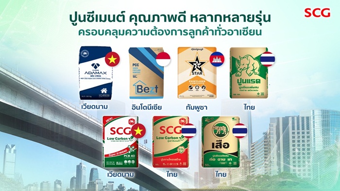 เอสซีจี ซีเมนต์แอนด์กรีนโซลูชัน เร่งผลักดันปูนคาร์บอนต่ำ เจเนอเรชัน 2 ซึ่งสามารถลดคาร์บอนไดออกไซด์ได้ร้อยละ 15-20 เมื่อเทียบกับปูนซีเมนต์เดิม โดยขยายสู่ตลาดต่างประเทศ ทั้งสหรัฐอเมริกา และออสเตรเลีย ซึ่งได้สร้างความมั่นใจในคุณภาพการใช้งานจนสามารถส่งออกสหรัฐอเมริกาได้แล้วมากกว่า 1 ล้านตัน ล่าสุด เปิดตัวปูนคาร์บอนต่ำรายแรกในเวียดนาม ‘SCG Low Carbon Super Cement’ ขณะที่ในไทยตลาดโตต่อเนื่อง สัดส่วนการใช้ทดแทนปูนแบบเดิมกว่าร้อยละ 86 พร้อมหนุนงานโครงการก่อสร้างภาครัฐที่เพิ่มมากขึ้น นอกจากนี้ ได้ออกปูนซีเมนต์หลากหลายรุ่น คุณภาพและราคาเหมาะสม เพื่อตอบโจทย์ลูกค้าครอบคลุมมากขึ้น เช่น แบรนด์ ‘5 STAR’ ในกัมพูชา ‘BEZT’ ในอินโดนีเซีย ‘ADAMAX’ ในเวียดนาม และ ‘แรด’ ในไทย