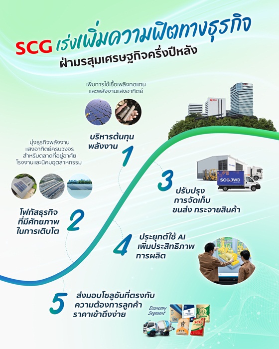 แม้เอสซีจีได้รับผลกระทบจากวัฏจักรปิโตรเคมีโลกยังอยู่ในช่วงขาลง ความตึงเครียดจากความขัดแย้งทางภูมิรัฐศาสตร์ ตลาดแข่งขันสูงจากสินค้านำเข้าจากจีน เศรษฐกิจในประเทศฟื้นตัวช้าจากกำลังซื้อที่อ่อนแอในกลุ่มผู้มีรายได้ปานกลาง-น้อย เอสซีจีเร่งเพิ่มความฟิตทางธุรกิจ สร้างความยืดหยุ่นในการดำเนินงาน ด้วย 1.) บริหารต้นทุนพลังงาน อาทิ ธุรกิจซีเมนต์ในไทยเพิ่มการใช้เชื้อเพลิงทดแทนได้ร้อยละ 47 2.) โฟกัสธุรกิจที่มีศักยภาพในการเติบโต เช่น มุ่งธุรกิจพลังงานแสงอาทิตย์ครบวงจรสำหรับตลาดที่อยู่อาศัย โรงงานและนิคมอุตสาหกรรม 3.) ปรับปรุงการจัดเก็บ ขนส่ง กระจายสินค้า เช่น ใช้เทคโนโลยีดิจิทัลวางแผนการจัดส่ง ตรวจรับสินค้า ช่วยลดเวลาทำงาน ลดความเสียหาย ลดโอกาสผิดพลาดในการรับ-ส่ง 4.) ประยุกต์ใช้ปัญญาประดิษฐ์ (AI) เพิ่มประสิทธิภาพการผลิต โดยเอสซีจี เคมิคอลส์ใช้โซลูชัน AI จาก REPCO NEX ในการดูแลเครื่องจักรและซ่อมบำรุงได้อย่างแม่นยำ มีเสถียรภาพ (Reliability) ถึงร้อยละ 100 5.) มุ่งส่งมอบโซลูชันที่ฟังก์ชันและราคาตรงกับความต้องการของลูกค้า อาทิ CPAC รถโม่เล็กขนาดกะทัดรัด สำหรับงานก่อสร้างในเมืองที่มีซอยเล็ก บรรทุกคอนกรีตได้มากสุด 2 คิวต่อเที่ยว ช่วยบริหารปริมาณการใช้ปูนซีเมนต์ได้ง่าย ลดการเหลือทิ้ง”