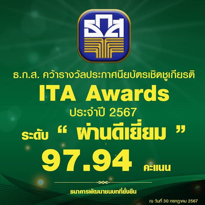 (วันนี้ 30 กรกฎาคม 2567) ณ ห้องนนทบุรี อาคาร 4 สำนักงาน ป.ป.ช. สนามบินน้ำ จังหวัดนนทบุรี นายฉัตรชัย ศิริไล ผู้จัดการธนาคารเพื่อการเกษตรและสหกรณ์การเกษตร (ธ.ก.ส.) เข้ารับประกาศนียบัตรการประเมินคุณธรรมและความโปร่งใสในการดำเนินงานของหน่วยงานภาครัฐ (Integrity and Transparency Assessment : ITA) ประจำปีงบประมาณ พ.ศ. 2567 ระดับผ่านดีเยี่ยม จัดขึ้นภายใต้แนวคิด Transparency with Quality