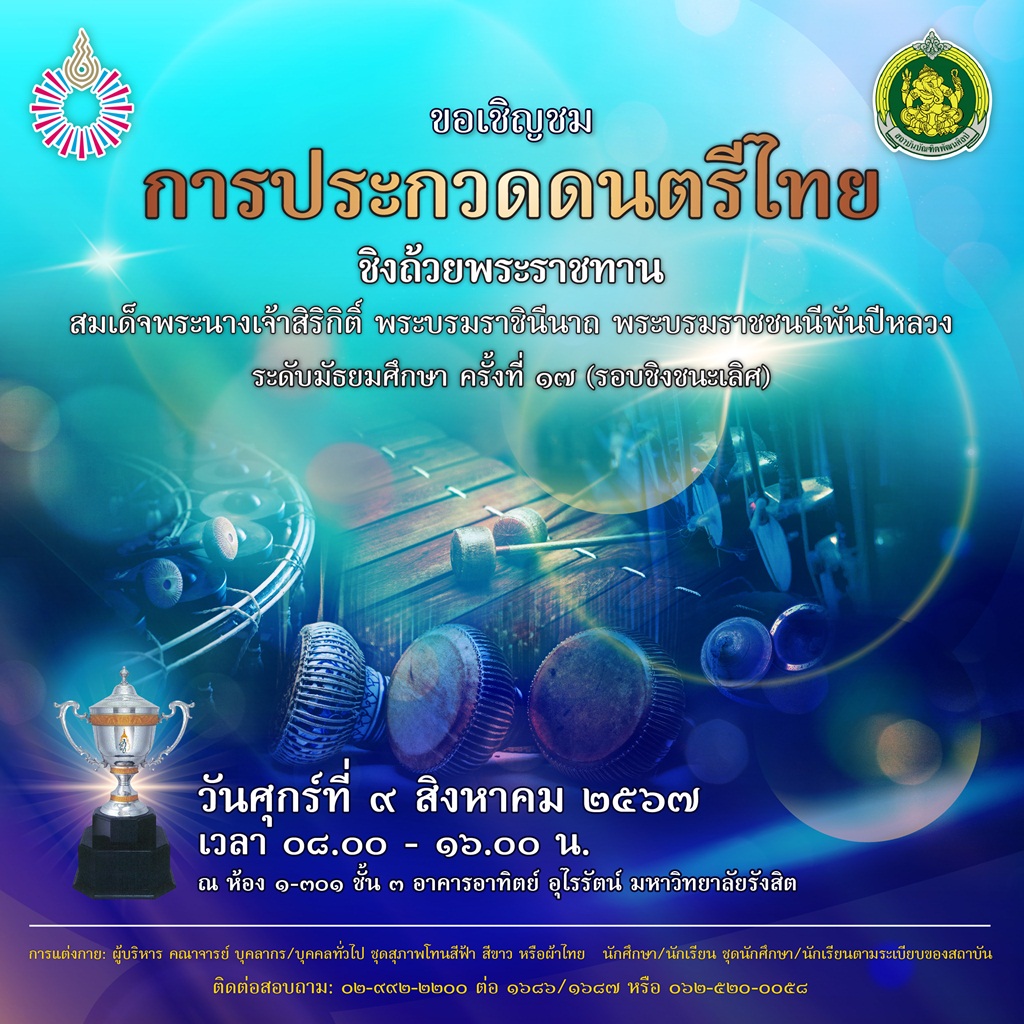 มหาวิทยาลัยรังสิต ร่วมด้วย สถาบันบัณฑิตพัฒนศิลป์ ขอเชิญชมการประกวดดนตรีไทยเฉลิมพระเกียรติ ชิงถ้วยพระราชทาน สมเด็จพระนางเจ้าสิริกิติ์ พระบรมราชินีนาถ พระบรมราชชนนีพันปีหลวง ระดับมัธยมศึกษา ครั้งที่ ๑๗ (รอบชิงชนะเลิศ) ในวันศุกร์ที่ ๙ สิงหาคม ๒๕๖๗ เวลา ๐๘.๐๐-๑๖.๐๐ น. ณ ห้อง ๑-๓๐๑ ชั้น ๓ อาคารอาทิตย์ อุไรรัตน์ (อาคาร ๑) มหาวิทยาลัยรังสิต