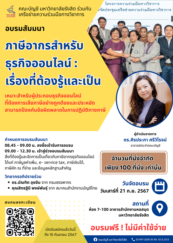 คณะบัญชี มหาวิทยาลัยรังสิต ร่วมกับ เครือข่ายความร่วมมือทางวิชาการ จัดอบรมสัมมนา “ภาษีอากรสำหรับธุรกิจออนไลน์ : เรื่องที่ต้องรู้และเป็น” ในวันเสาร์ที่ 21 กันยายน 2567 เวลา 09.00 – 12.30 น. ณ ห้อง 7-100 อาคารสำนักงานหอสมุด มหาวิทยาลัยรังสิต