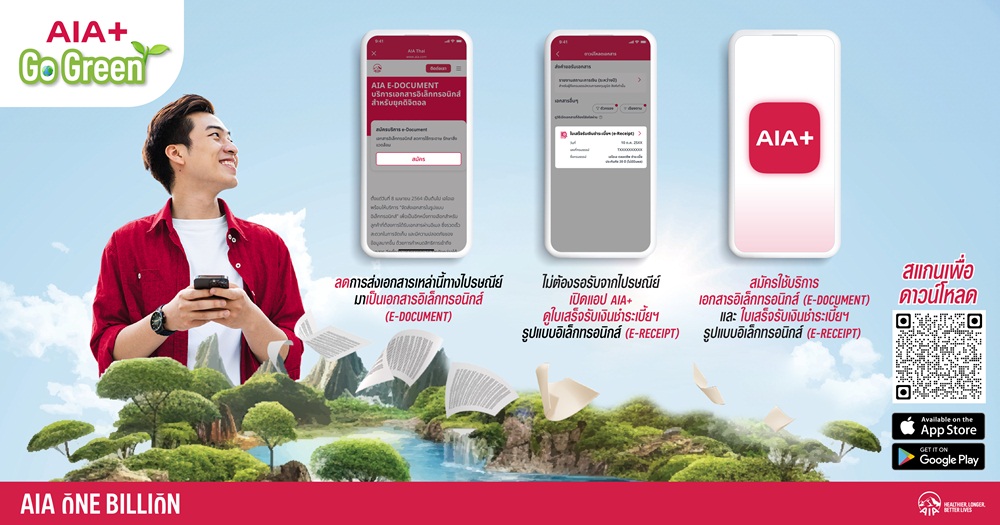 ร่วมเป็นส่วนหนึ่งของแคมเปญ AIA+ Go Green เพื่อมุ่งสู่การเปลี่ยนแปลงที่สำคัญ ลดภาระให้สิ่งแวดล้อม เปลี่ยนสู่ธุรกรรมอิเล็กทรอนิกส์ ที่มีความสะดวกและปลอดภัย ด้วยการดาวน์โหลดแอป AIA+ พร้อมสมัครรับบริการ e-Document และ e-Receipt เพียงเท่านี้ก็สามารถช่วยรักษ์โลกไปกับ เอไอเอ ประเทศไทย