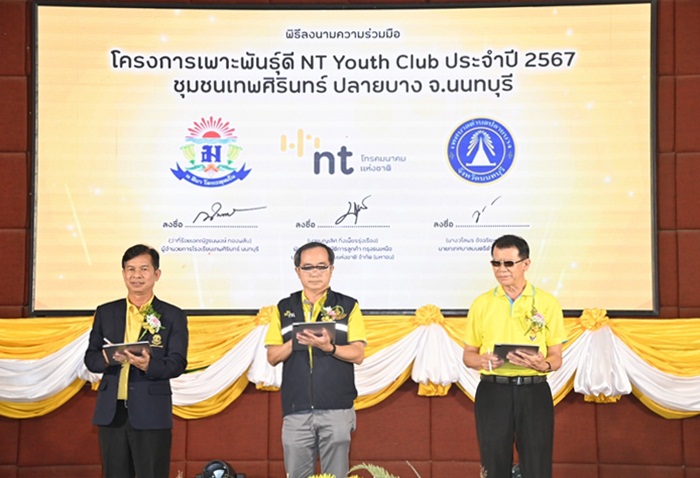 บริษัท โทรคมนาคมแห่งชาติ จำกัด (มหาชน) หรือ NT จัดกิจกรรม CSR ประจำปี 2567 โครงการ “เพาะพันธุ์ดี NT Youth Club” โดยมี นายสุธี ทองแย้ม ผู้ว่าราชการจังหวัดนนทบุรี เป็นประธานในพิธีลงนามความร่วมมือระหว่างผู้แทน 3 หน่วยงานภาครัฐที่เข้าร่วมโครงการเพาะพันธุ์ดี NT Youth Club ชุมชนเทพศิรินทร์ปลายบาง จังหวัดนนทบุรี ได้แก่ ว่าที่ร้อยเอก ณัฐธนพงษ์ ทองพลับ ผู้อำนวยการโรงเรียนเทพศิรินทร์ นนทบุรี นายพรประสิทธิ์ เจษฎาภัทรกุล รองนายกเทศมนตรีตำบลปลายบาง จังหวัดนนทบุรี และนายบุญเลิศ กิ่งเพ็ชรรุ่งเรือง ผู้จัดการฝ่ายขายและปฏิบัติการลูกค้า กรุงธนเหนือNT โดยมี นายสมยศ ธนพิรุณธร รองกรรมการผู้จัดการใหญ่สายงานขายและปฏิบัติการลูกค้า1และนายชนินทร์ สีหะโชติ ผู้ช่วยกรรมการผู้จัดการใหญ่ กลุ่มตลาดและบริการลูกค้า บริษัท โทรคมนาคมแห่งชาติ จำกัด (มหาชน) ร่วมเป็นสักขีพยาน ณ หอประชุม โรงเรียนเทพศิรินทร์ นนทบุรี อำเภอบางกรวย จังหวัดนนทบุรี เพื่อส่งเสริมและพัฒนาความรู้ด้านดิจิทัล โดยเน้นทักษะการนำเทคโนโลยีดิจิทัล โดยการพัฒนาเยาวชนในชุมชนให้สามารถร่วมกลุ่มพัฒนาศักยภาพของชุมชน ฝึกให้เยาวชนมีความคิดเป็นผู้ประกอบการยุคดิจิทัลโดยใช้เทคโนโลยี IoT เพื่อเป็นประโยชน์ต่อยอดในการเพิ่มรายได้ของชุมชน สังคม วัฒนธรรมการท่องเที่ยว และการเรียนรู้ อย่างมีประสิทธิภาพ