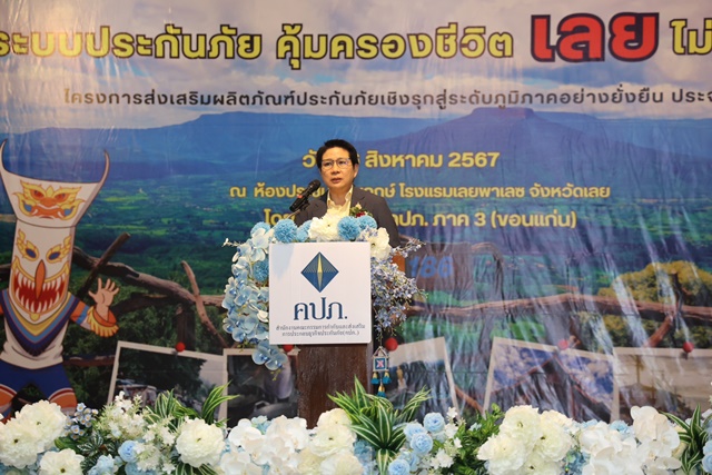 ในโอกาสนี้ รองเลขาธิการ คปภ. ด้านกำกับคนกลางและประกันภัยภูมิภาค เปิดเผยว่า สำนักงาน คปภ. มีนโยบายส่งเสริมให้ประชาชนทั่วประเทศเข้าถึงระบบประกันภัยและสามารถนำระบบประกันภัยใช้เป็นเครื่องมือในการบริหารความเสี่ยงได้อย่างเหมาะสม จึงได้จัดโครงการส่งเสริมผลิตภัณฑ์ประกันภัยเชิงรุกระดับภูมิภาคอย่างยั่งยืนทั่วประเทศ รวม 9 ภาค และในครั้งนี้ได้เลือกจังหวัดเลย ซึ่งเป็นหนึ่งในจังหวัดภายใต้การกำกับดูแลของสำนักงาน คปภ. ภาค 3 (ขอนแก่น) เป็นพื้นที่จัดโครงการส่งเสริมผลิตภัณฑ์ประกันภัยเชิงรุกสู่ระดับภูมิภาคอย่างยั่งยืน ปี 2567 โดยที่ผ่านมาจังหวัดเลยได้เผชิญกับความเสี่ยงภัยในด้านต่าง ๆ เช่น เหตุเพลิงไหม้อาคารพาณิชย์ครั้งใหญ่ใจกลางเมืองเลย และเหตุเพลิงไหม้โกดังโรงงานยางพาราที่อำเภอนาด้วง ส่งผลให้ทรัพย์สินและกิจการได้รับความเสียหาย ธุรกิจหยุดชะงัก ประกอบกับโครงสร้างเศรษฐกิจและอุตสาหกรรมของจังหวัดเลยมีลักษณะผสมกลมกลืนระหว่างภาคอุตสาหกรรมการเกษตรและการท่องเที่ยวทางธรรมชาติ โดยประชากรส่วนใหญ่ ประกอบอาชีพเกษตรกรรม รองลงมา คือ การรับจ้าง การค้าขาย การอุตสาหกรรม การทำเหมืองแร่ อีกทั้งยังมีผู้ประกอบการรถรับนักท่องเที่ยวเยี่ยมชมแหล่งท่องเที่ยวต่าง ๆ