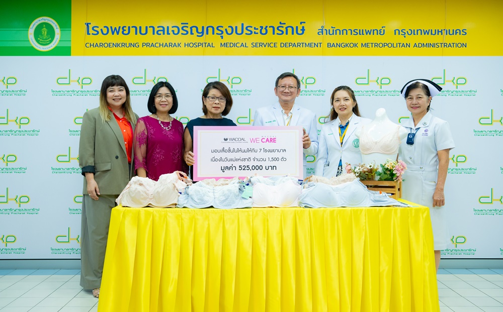 บริษัท ไทยวาโก้ จำกัด (มหาชน) นำโดย นางนงลักษณ์ เตชะบุญเอนก (ที่ 3 จากซ้าย) กรรมการบริหารสายงานสื่อสารองค์กรและกิจกรรมเพื่อสังคม มอบผลิตภัณฑ์เสื้อชั้นในให้นมบุตร ให้แก่นายแพทย์พรเทพ แซ่เฮ้ง ผู้อำนวยการ โรงพยาบาลเจริญกรุงประชารักษ์ เพื่อส่งมอบต่อให้กับคุณแม่ที่ต้องการให้นมบุตรแต่ขาดแคลนทุนทรัพย์ในการซื้อเสื้อชั้นในให้นม